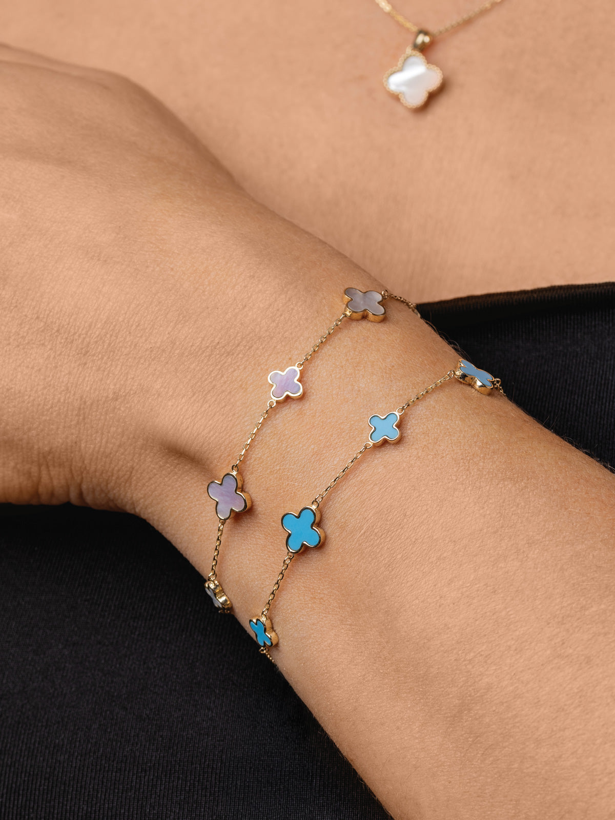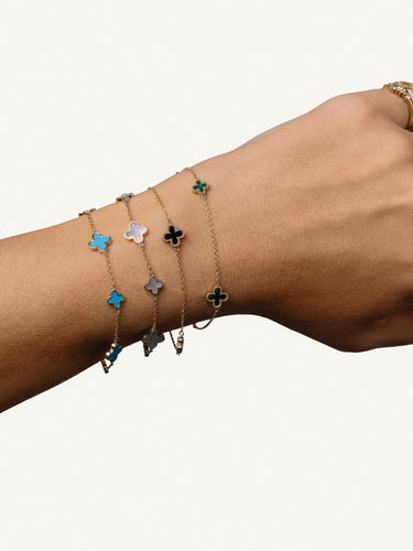 Our latest collection celebrates luck, beauty, and symbolism with delicate clover designs set in 9ct gold. Choose from vibrant semi-precious gemstones like malachite, onyx, and mother-of-pearl – each bracelet handcrafted to stack, gift, or wear solo. Adjustable lengths make them perfect for everyday wear, while the signature clover shape adds meaning and charm.