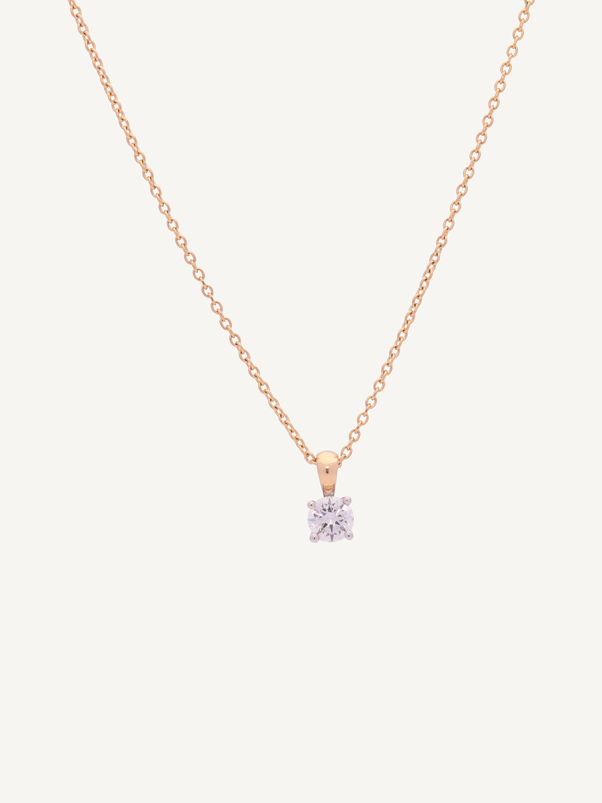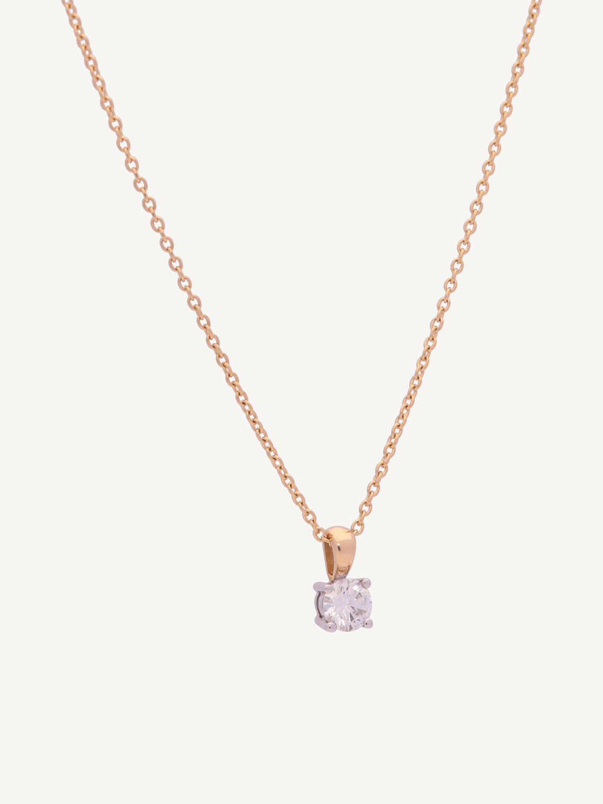 This beautiful 18ct yellow gold claw set round brilliant natural diamond pendant features a stunning 0.34ct solitaire diamond, claw set in 18ct white gold to enhance the diamond.