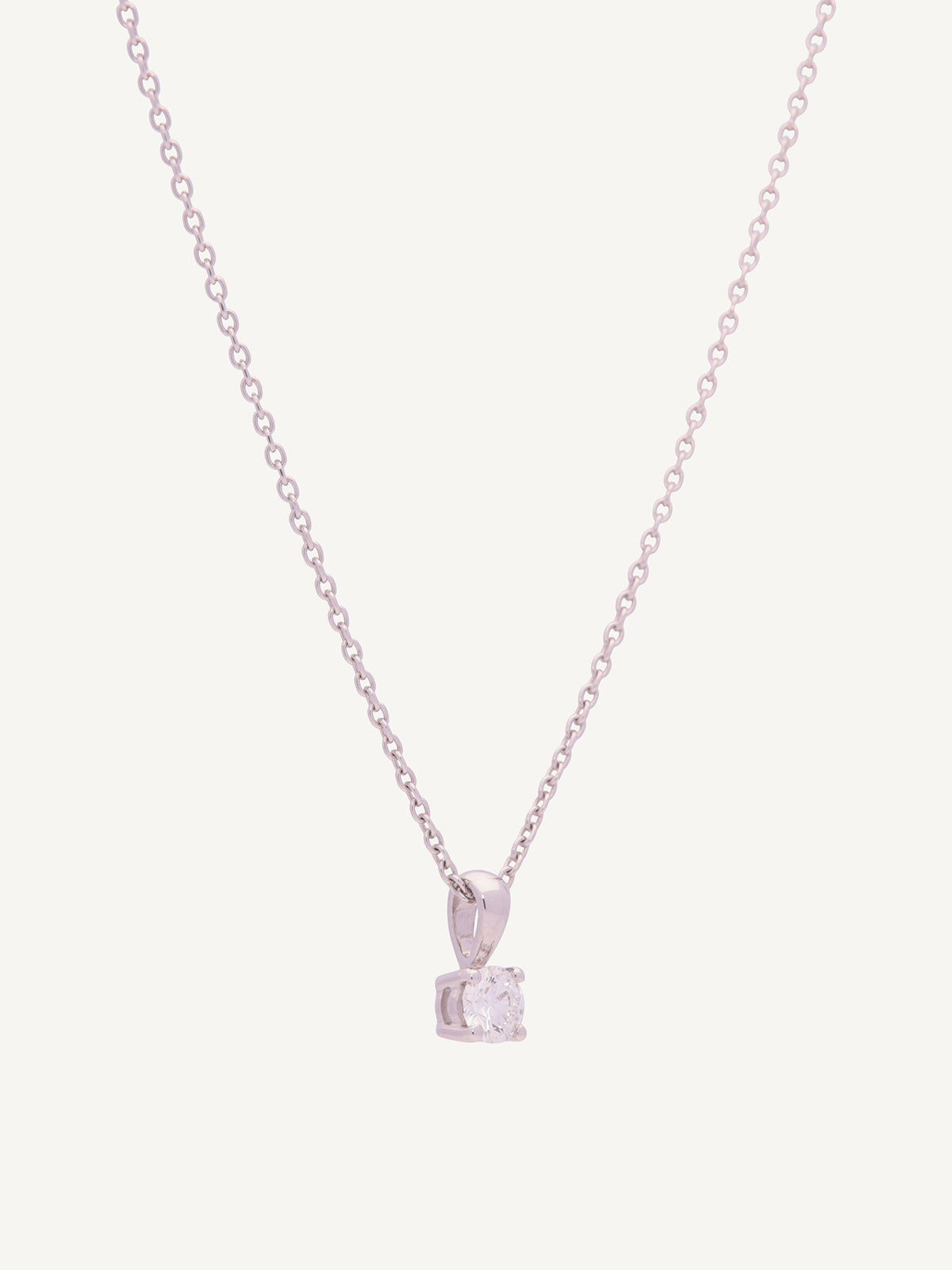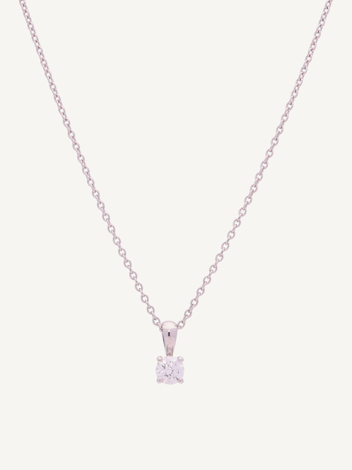 This beautiful claw set round brilliant natural diamond pendant features a stunning 0.26ct solitaire diamond set in 18ct white gold. Suspended on an 18" 18ct white gold trace chain this classic necklace is set to become a favourite piece.