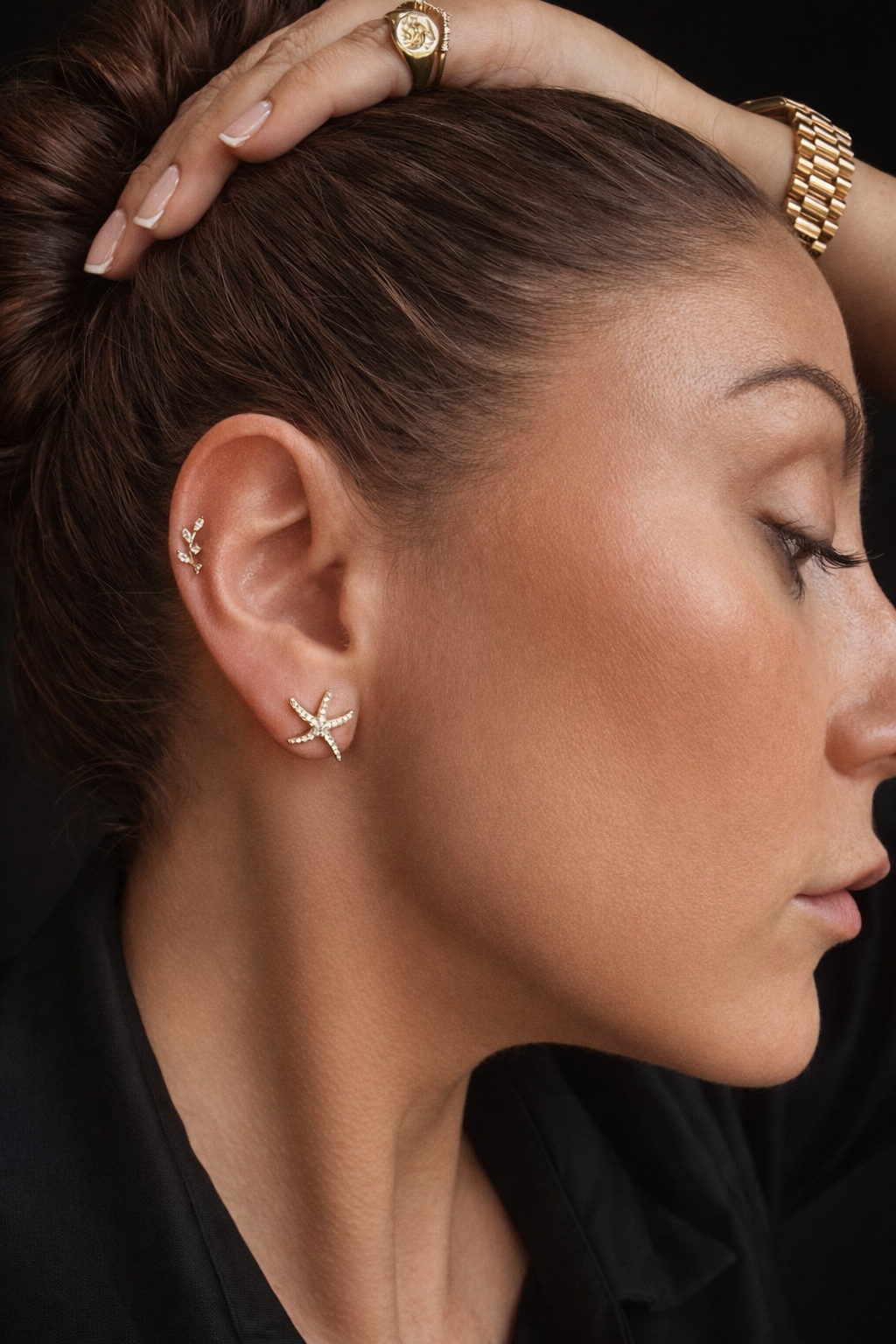 The earring of the moment, these 18ct yellow gold diamond set starfish ear studs are the perfect summer accessory.