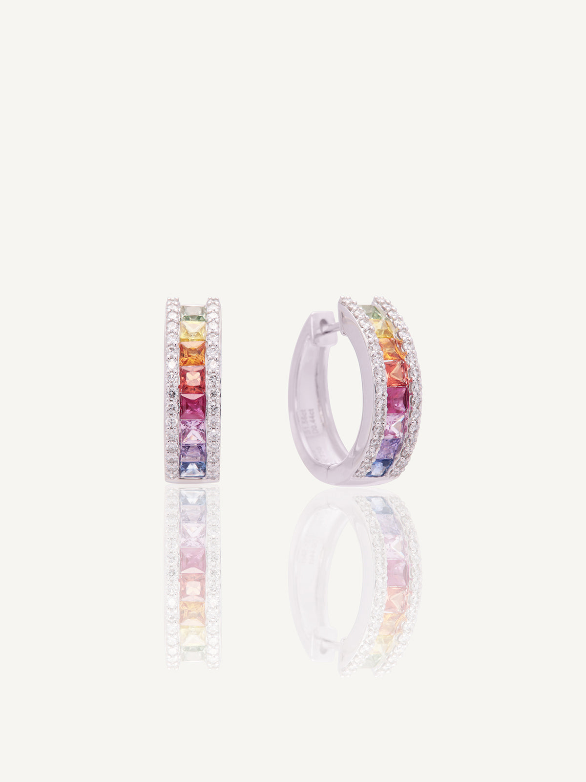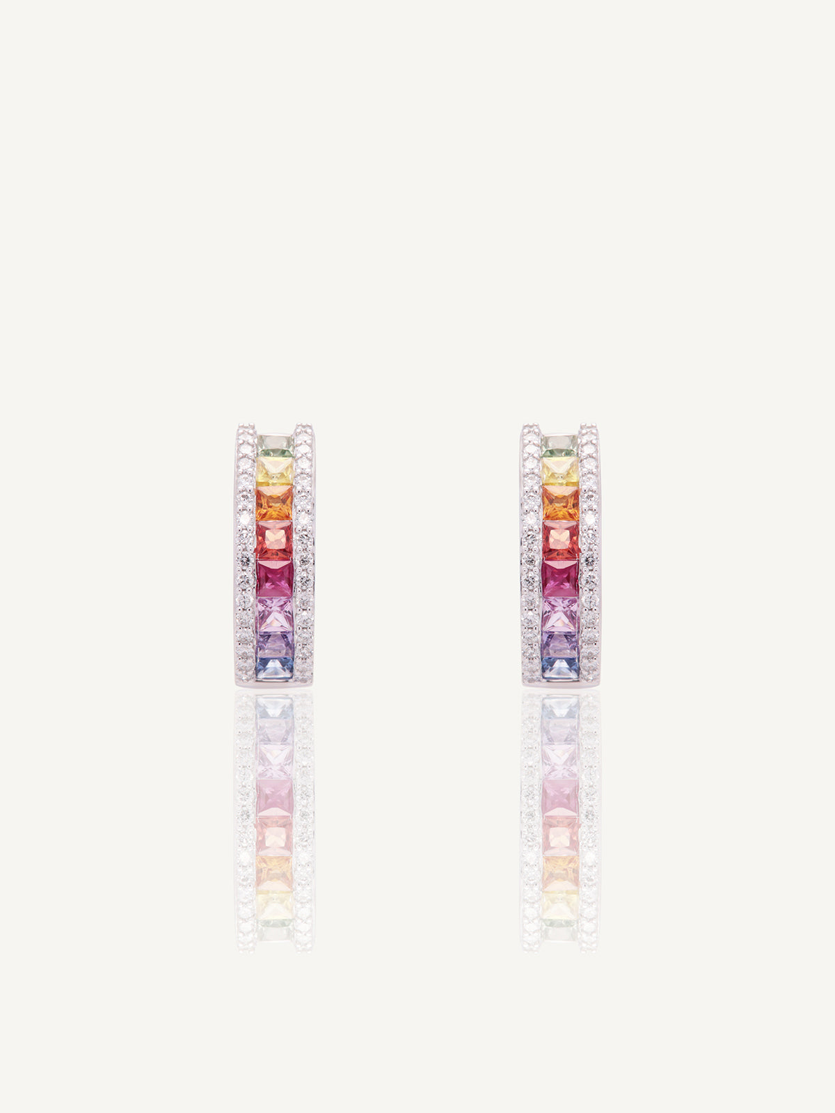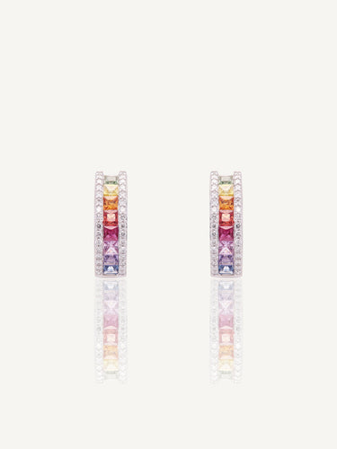 These stunning 18ct white gold chunky hoops feature two rows of dazzling diamonds set either side of a raindbow comprised of princess cut coloured sapphires.
