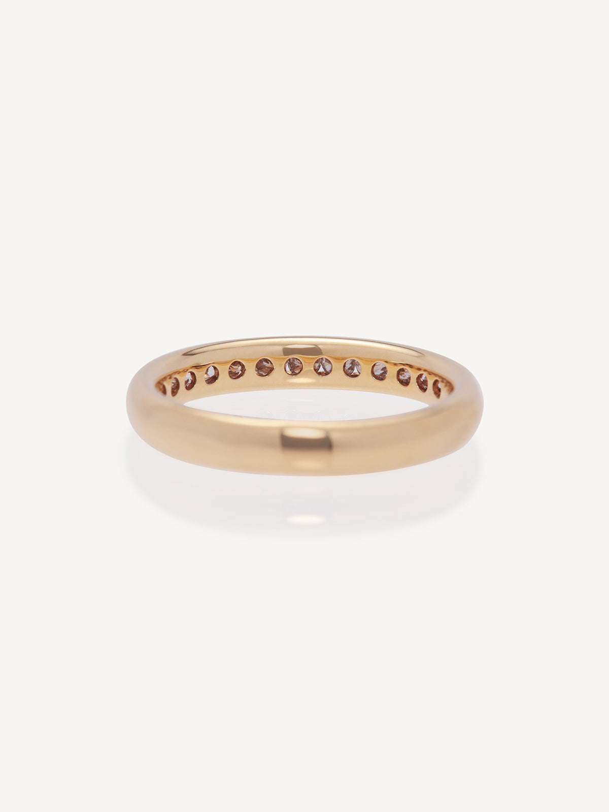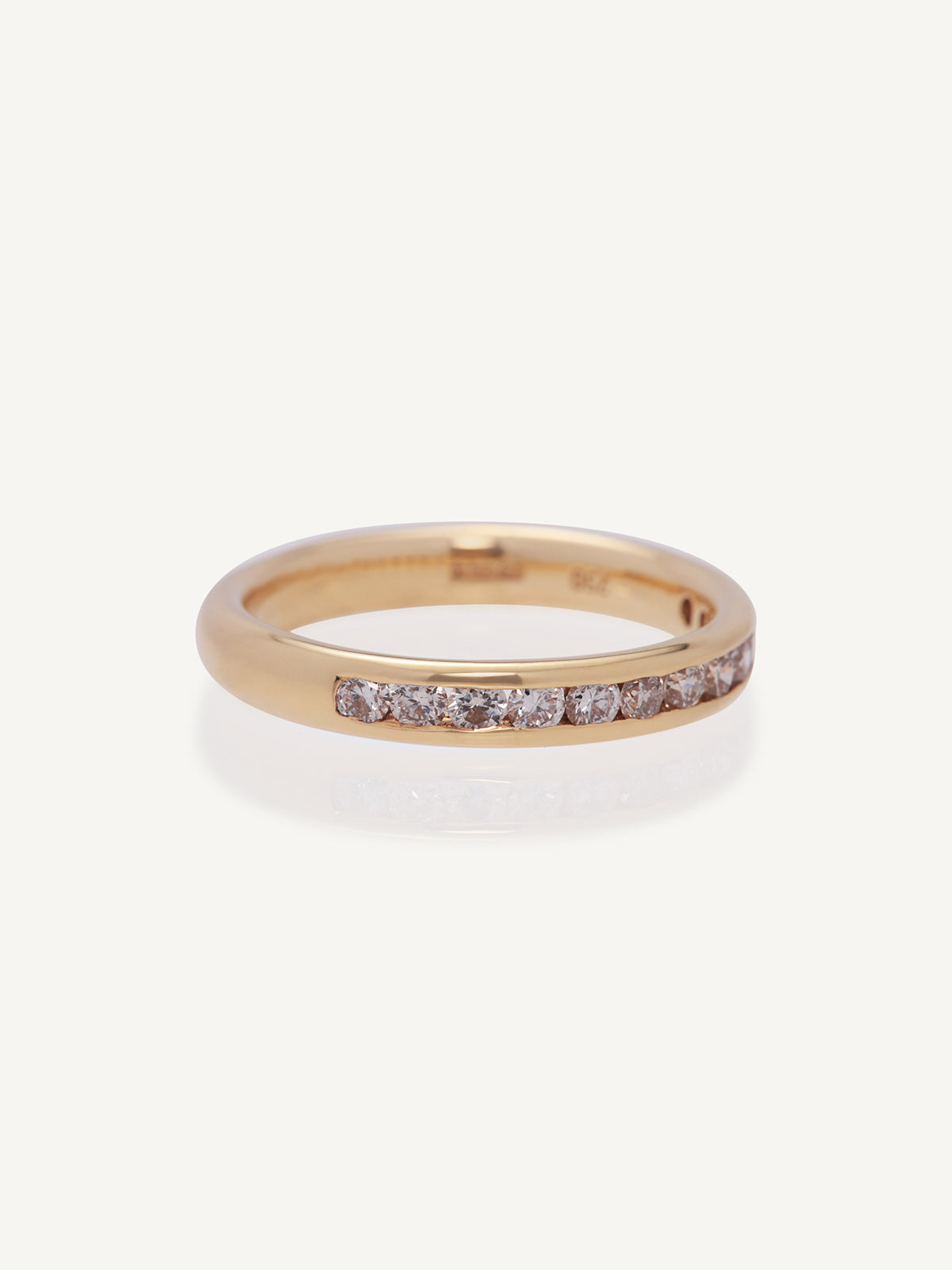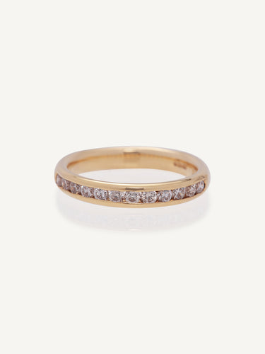 A stunning 1/2 eternity ring that features a row of high quality round cut diamonds channel set half the way around the ring. This ring is a statement on its own but also makes a beautiful wedding band.