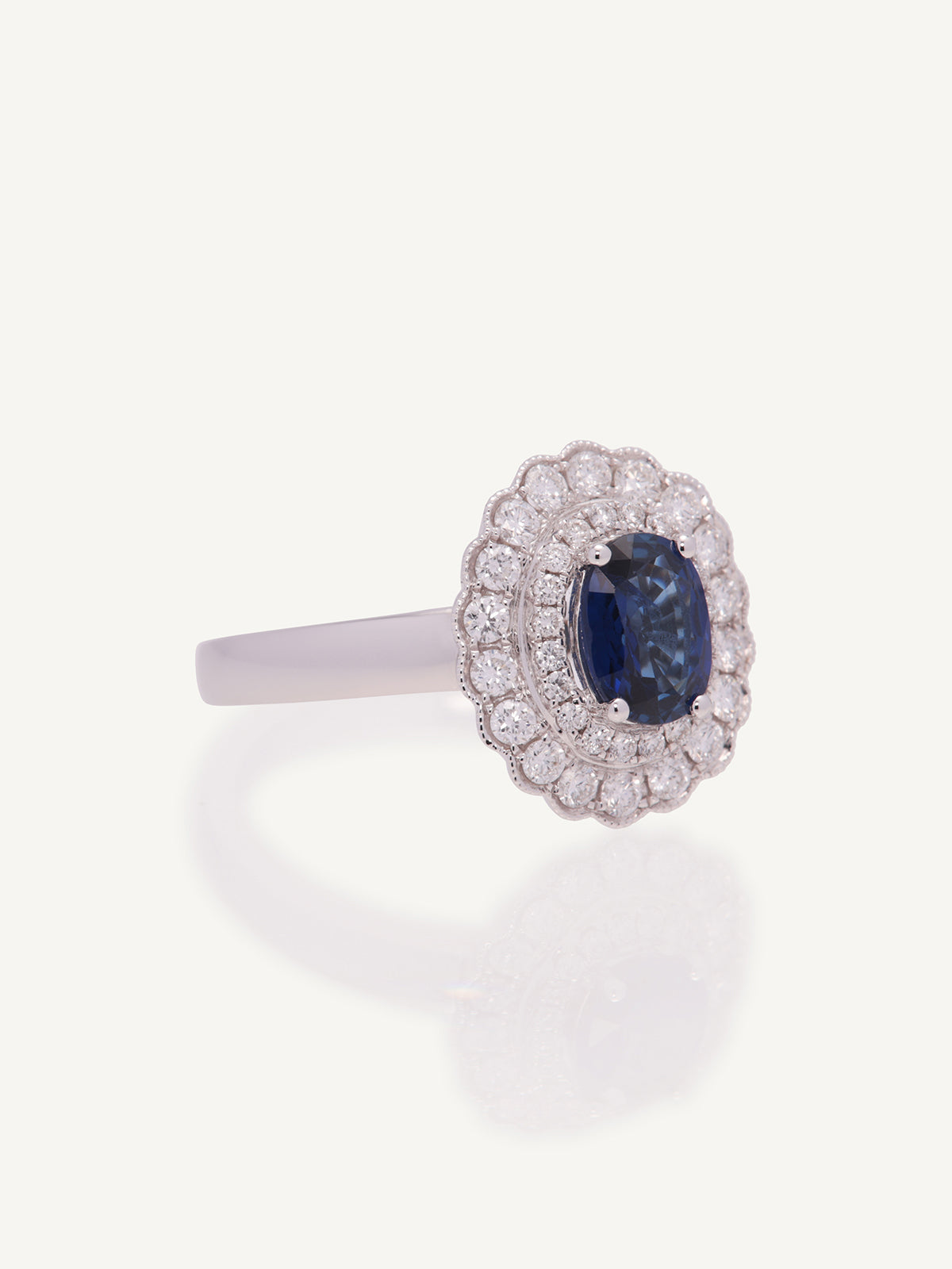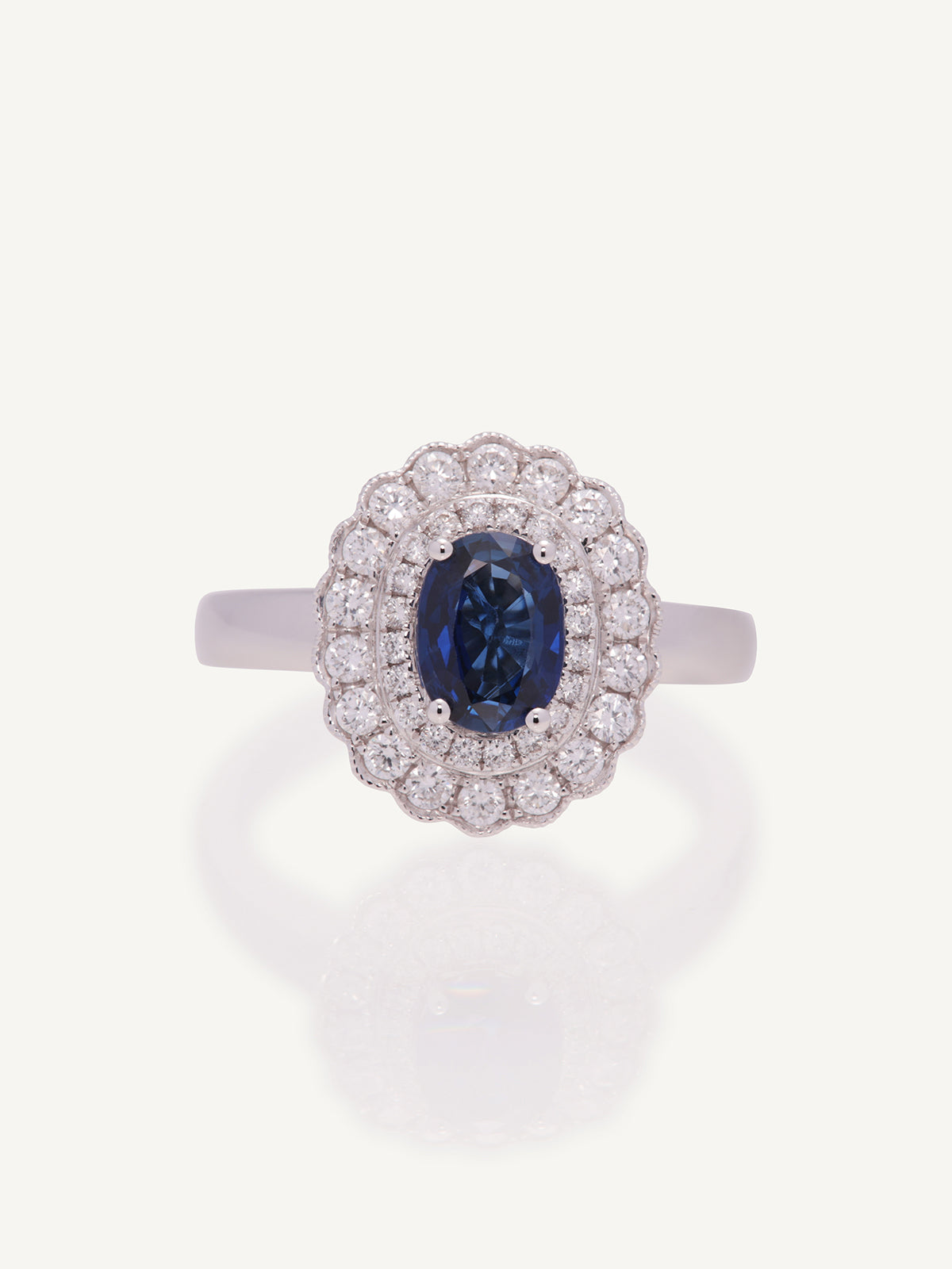 This beautiful claw set oval sapphire ring is set apart from the rest with an exquisite double diamond halo. Set in 18ct white gold this is an exceptional addition to any jewellery collection.