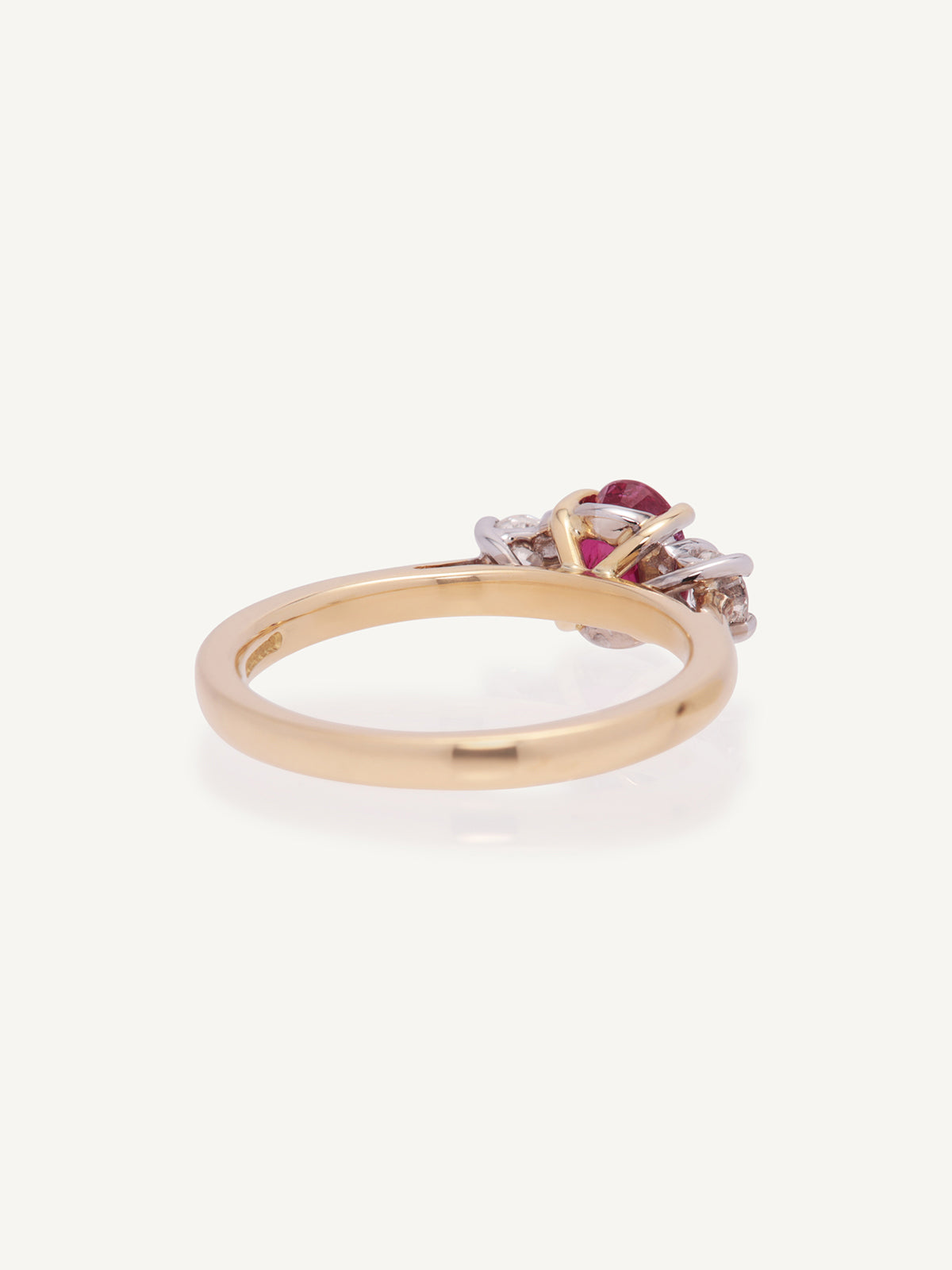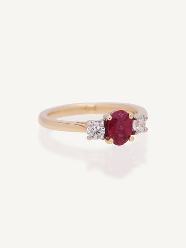 A beautiful 18ct yellow gold claw set oval ruby and diamond three stone ring. With diamonds set in white gold for additional sparkle, this is the perfect ring to mark a special occasion.