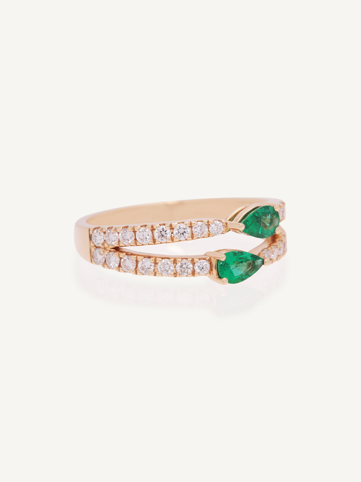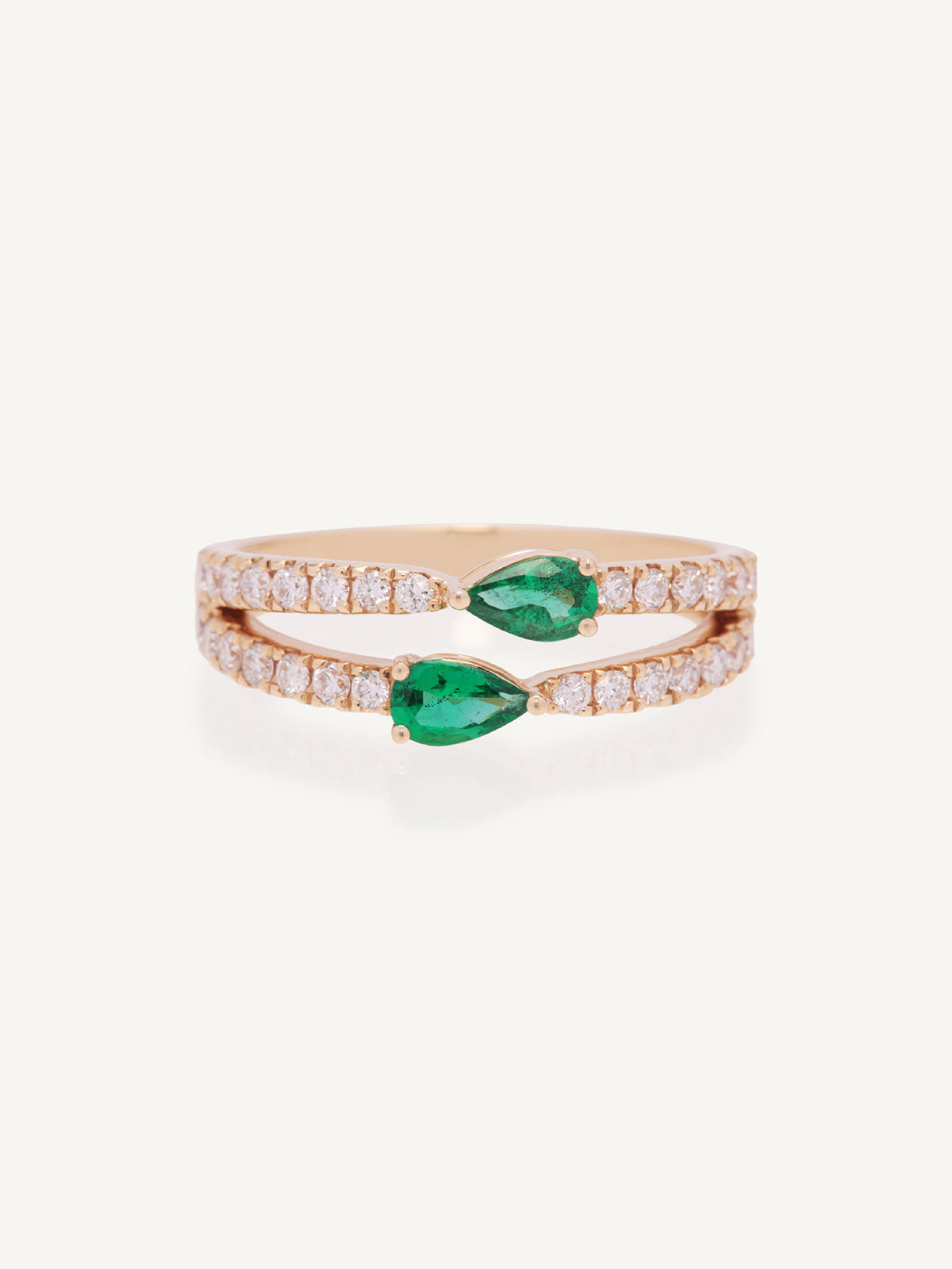 An exquisite 18ct yellow gold split shank ring, claw set with sparkling diamonds and a single vibrant pear cut emerald on each row.