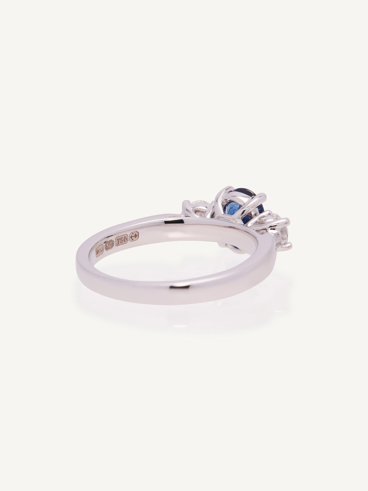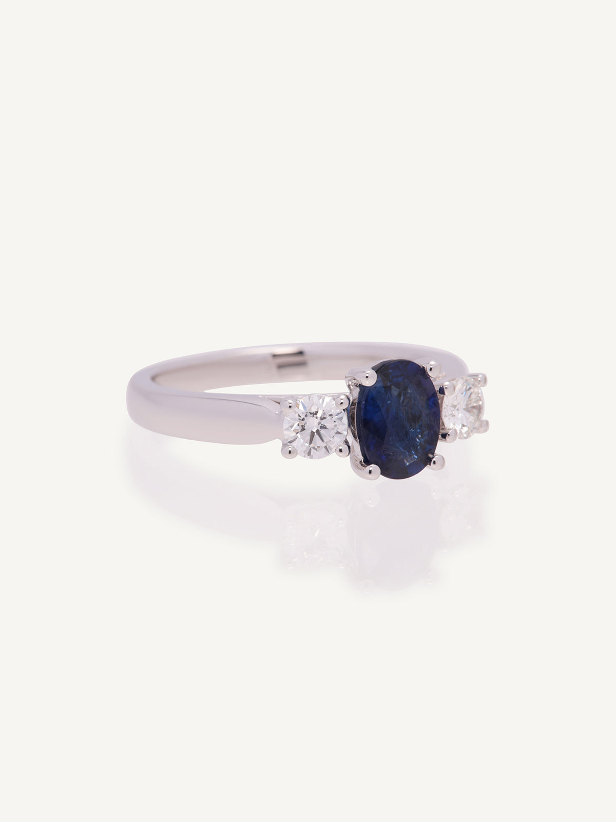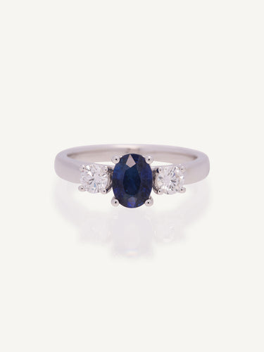 A beautiful platinum claw set oval sapphire and diamond three stone ring. The perfect ring to mark a special occasion.