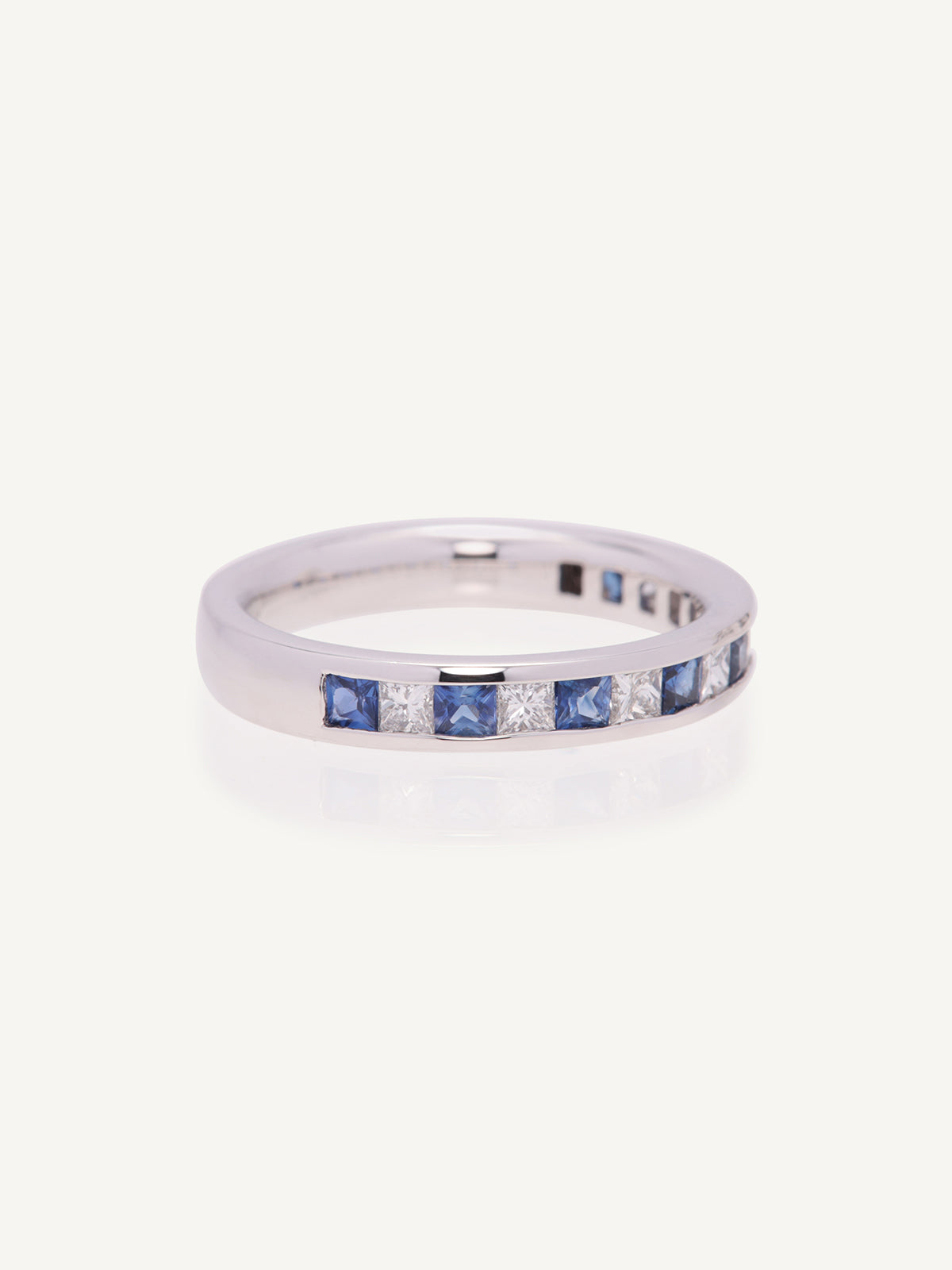Vibrant princess cut sapphires and diamonds, channel set in beautiful platinum. The perfect pop of colour for any jewellery collection.