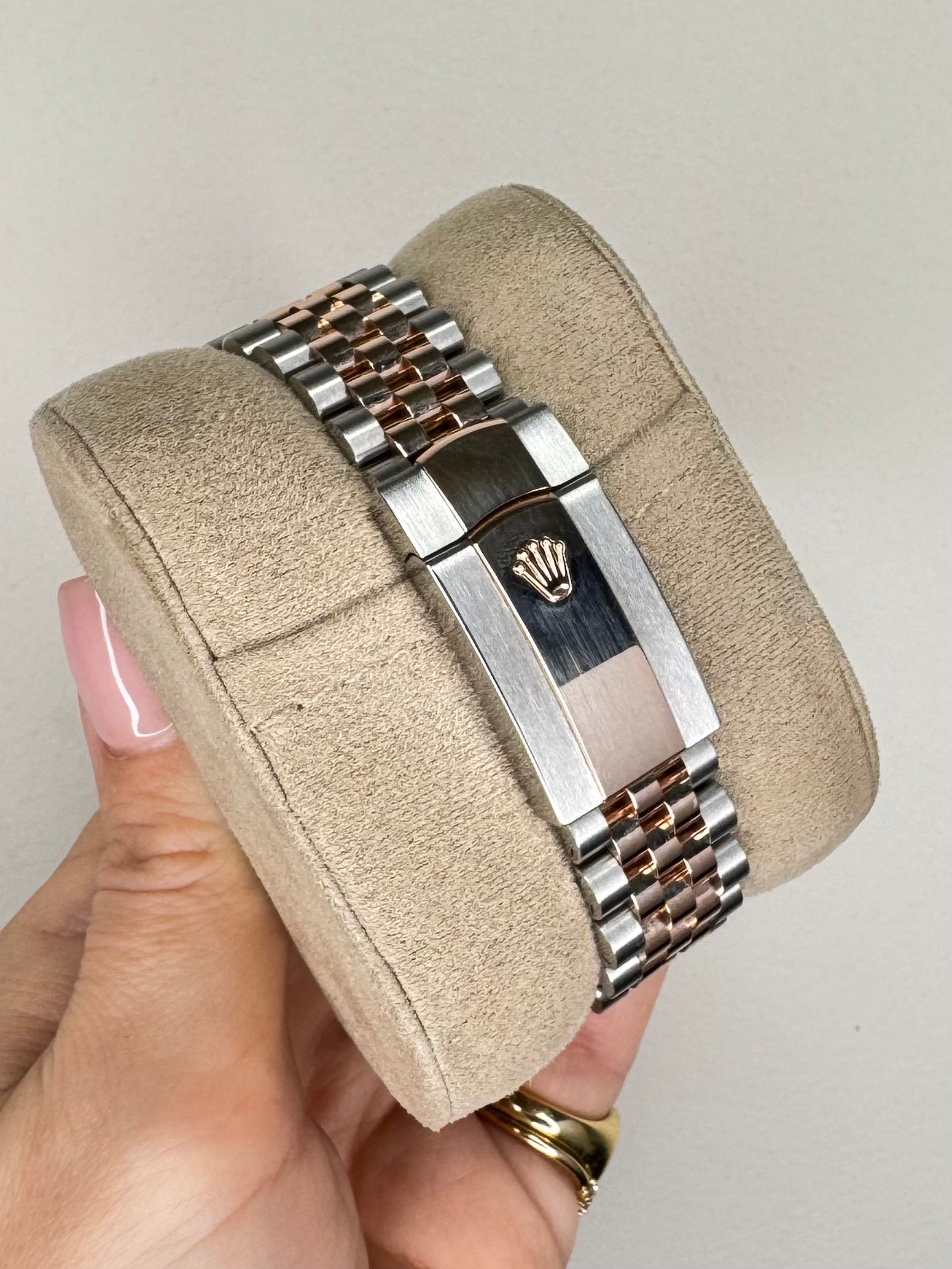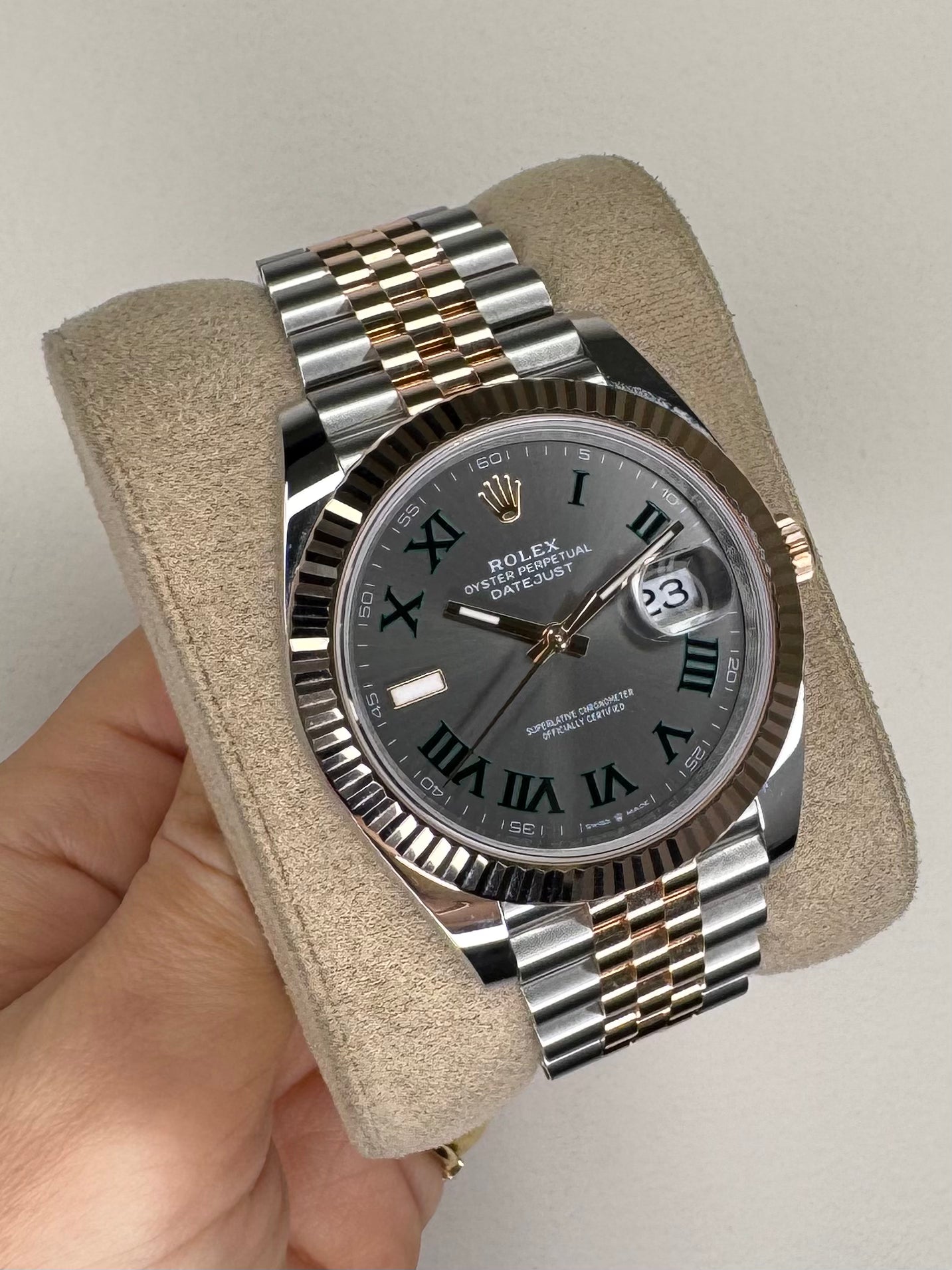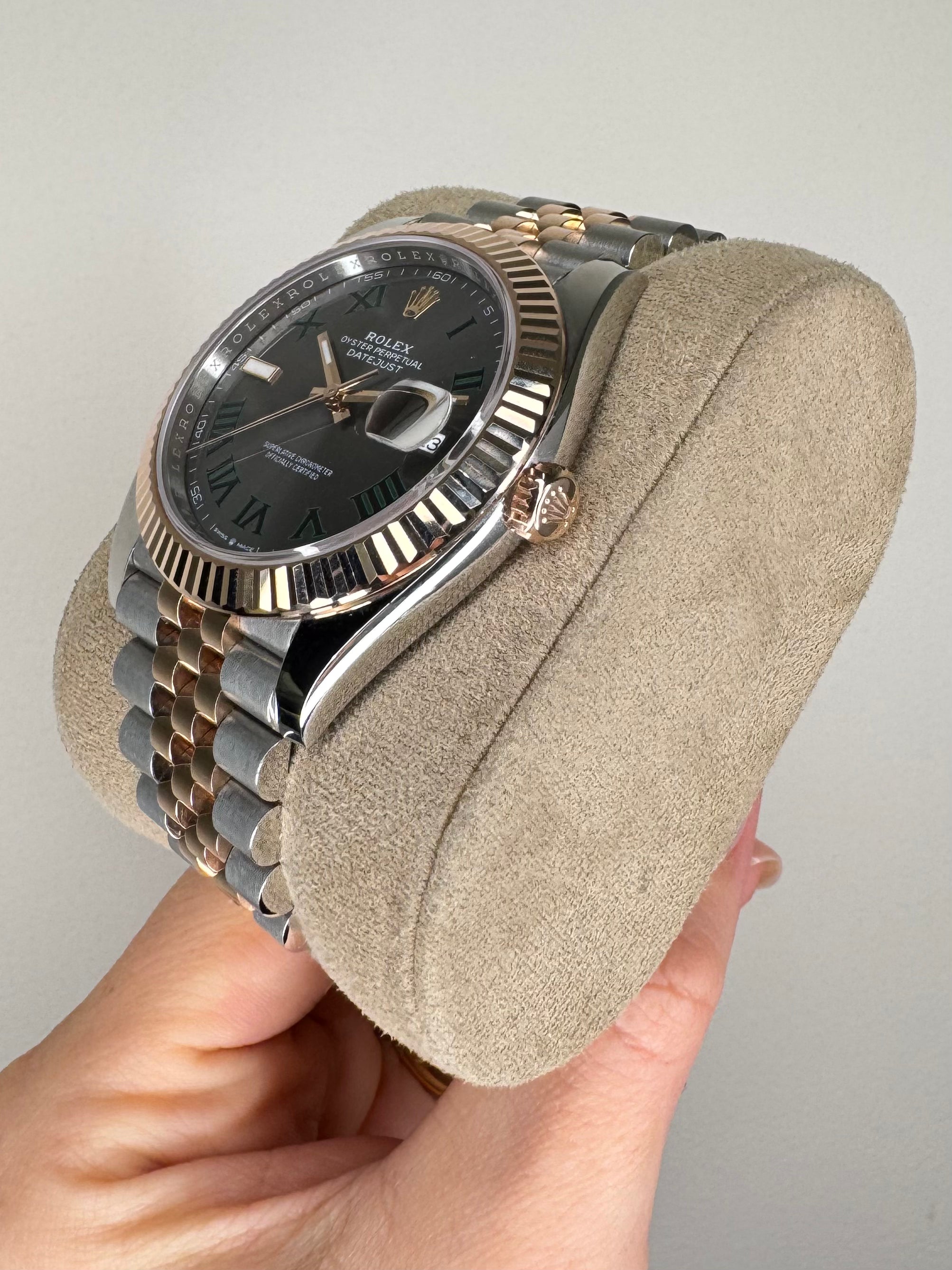 Rolex Datejust watch in stainless steel and 18ct rose gold, model reference 126331. 41mm case, 'Wimbledon' dial with date aperture at 3 o'clock, fluted 18ct rose gold bezel, automatic movement, Jubilee bracelet. Accompanied with a full set - Rolex box, guarantee card dated 2025, booklet, x2 Rolex Swing tags. This watch is under manufacturer warranty until 2030. If you require any further information, please do not hesitate to contact our helpful team.