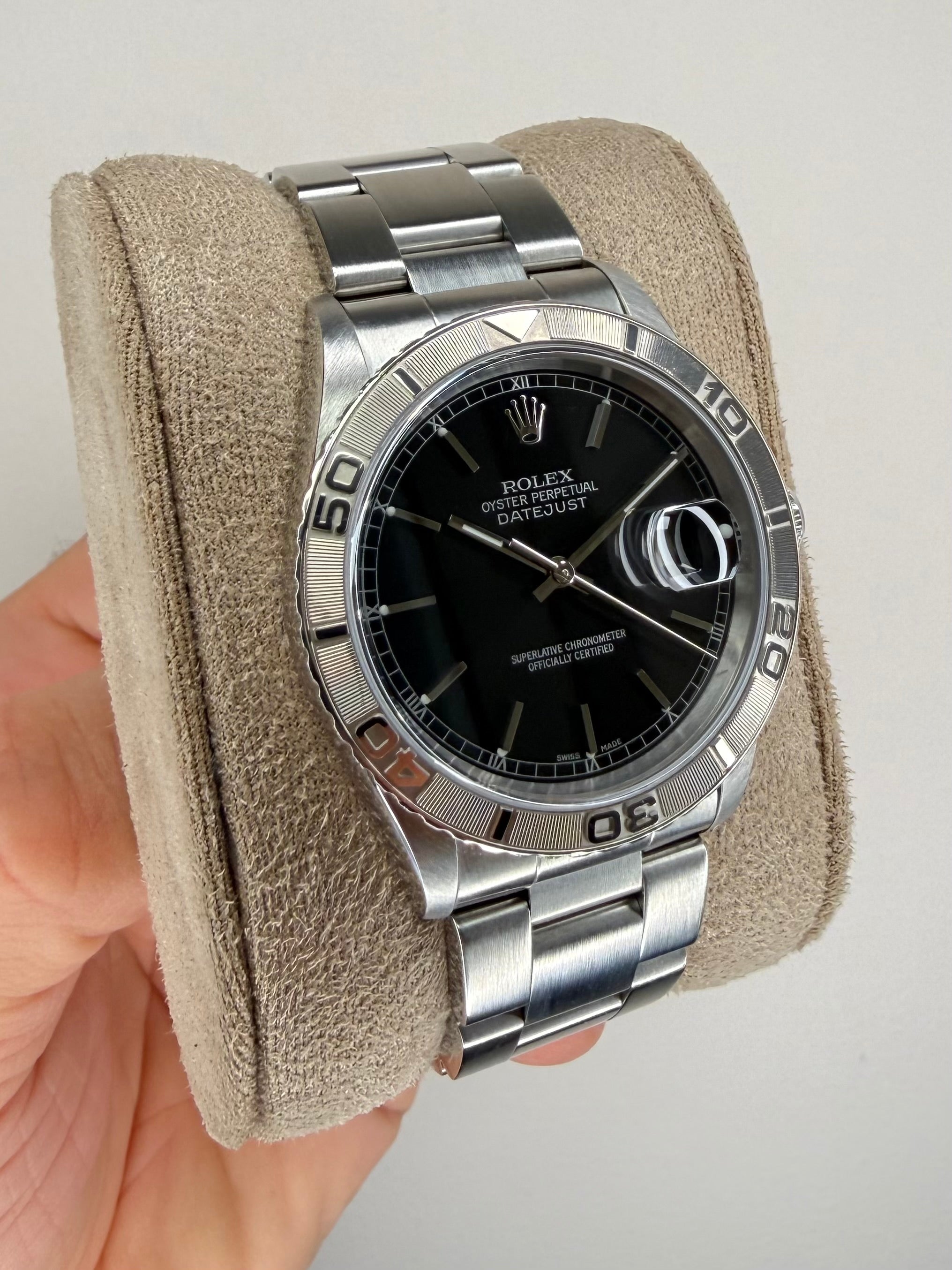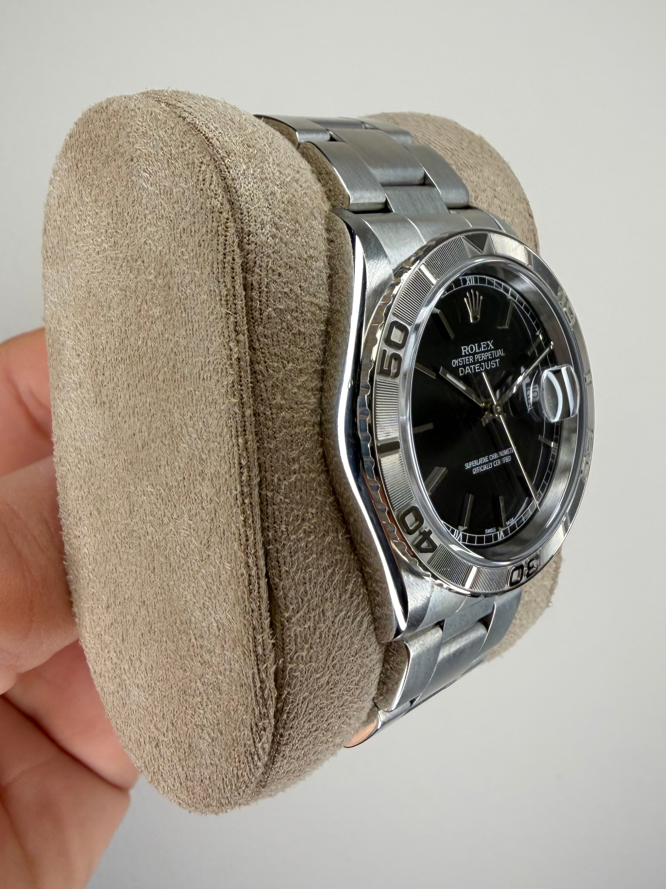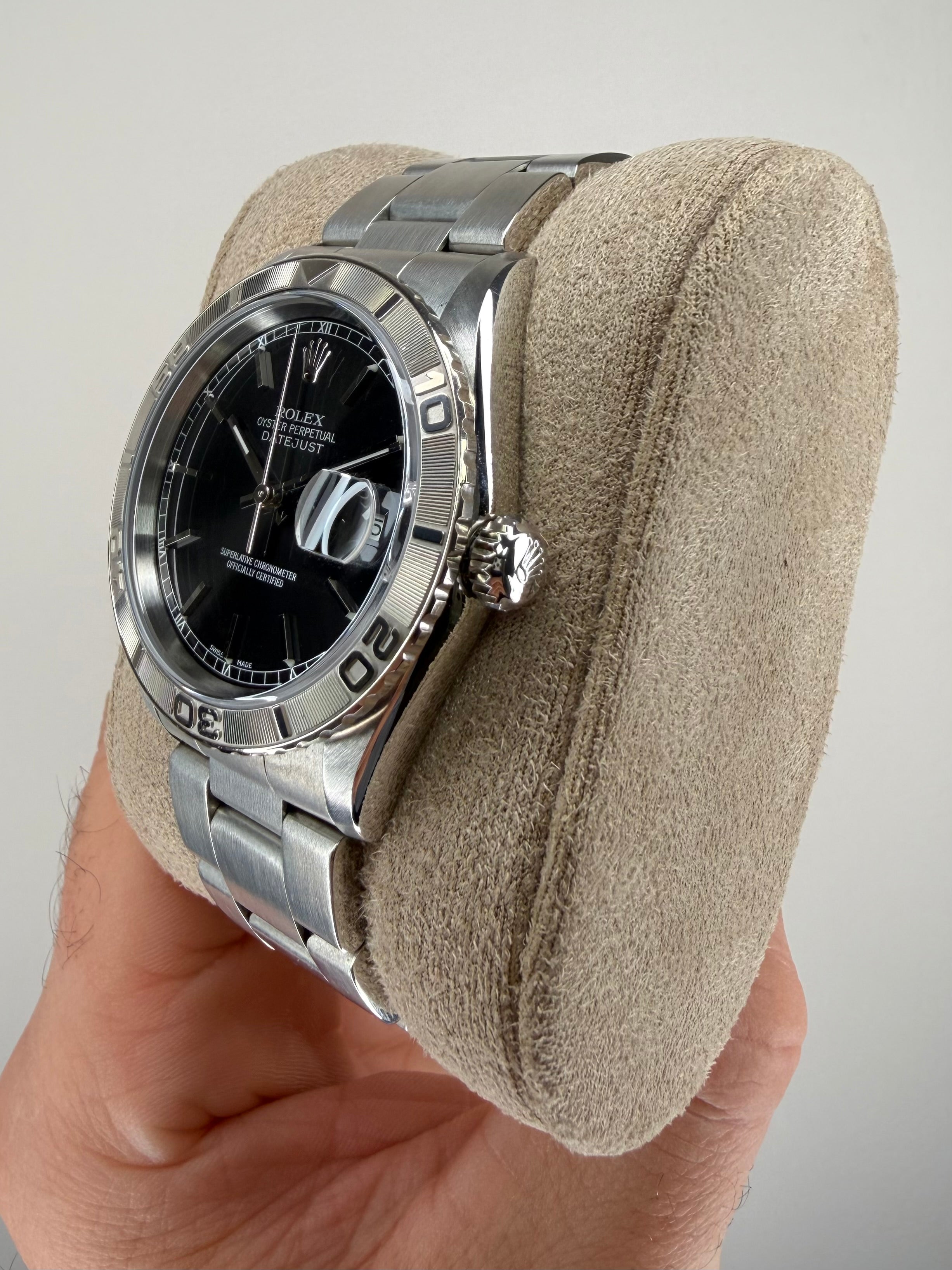 Excellent condition, hardly worn Rolex Datejust Turn-o-Graph in stainless steel, model reference 16264. 36mm case, black baton dial with date apaerture at 3 o'clock, Automatic movement, Oyster bracelet. Accompanied with Rolex box and booklet. Lanes pre-owned watches are accompanied with a full 12 month warranty. If you require any further information, please do not hesitate to contact our helpful team.