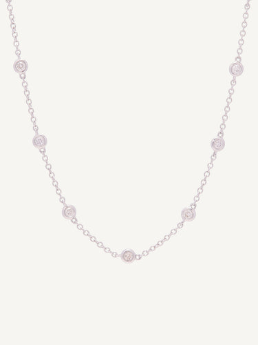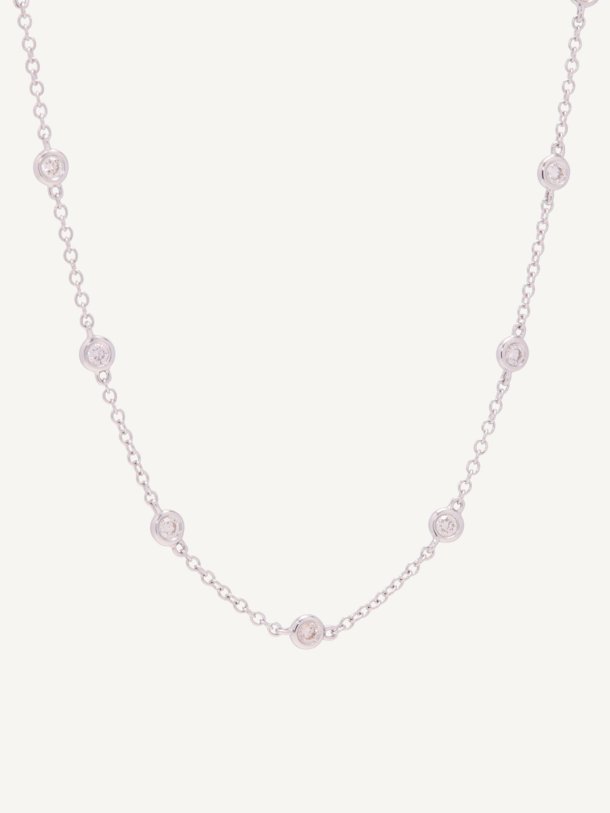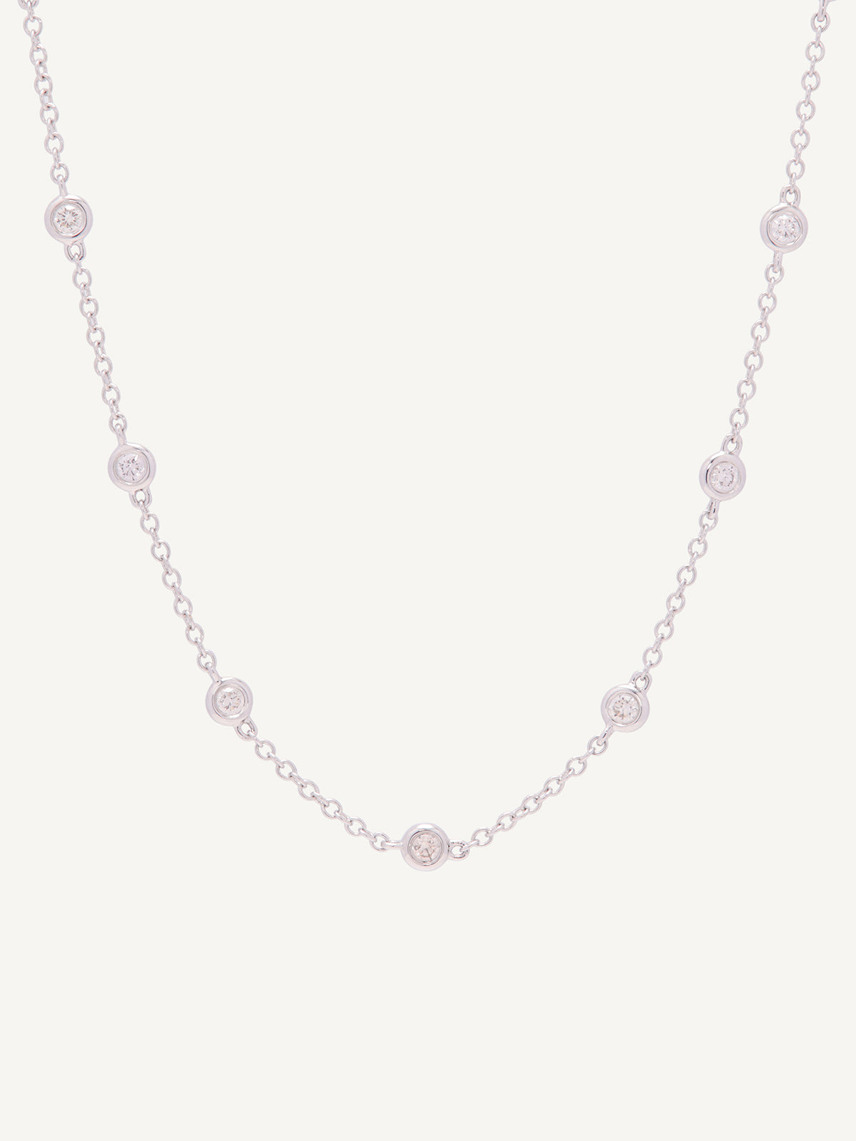 Set in 18ct white gold, this necklace features a stunning rub over set design with scattered natural diamonds that shimmer with every movement.