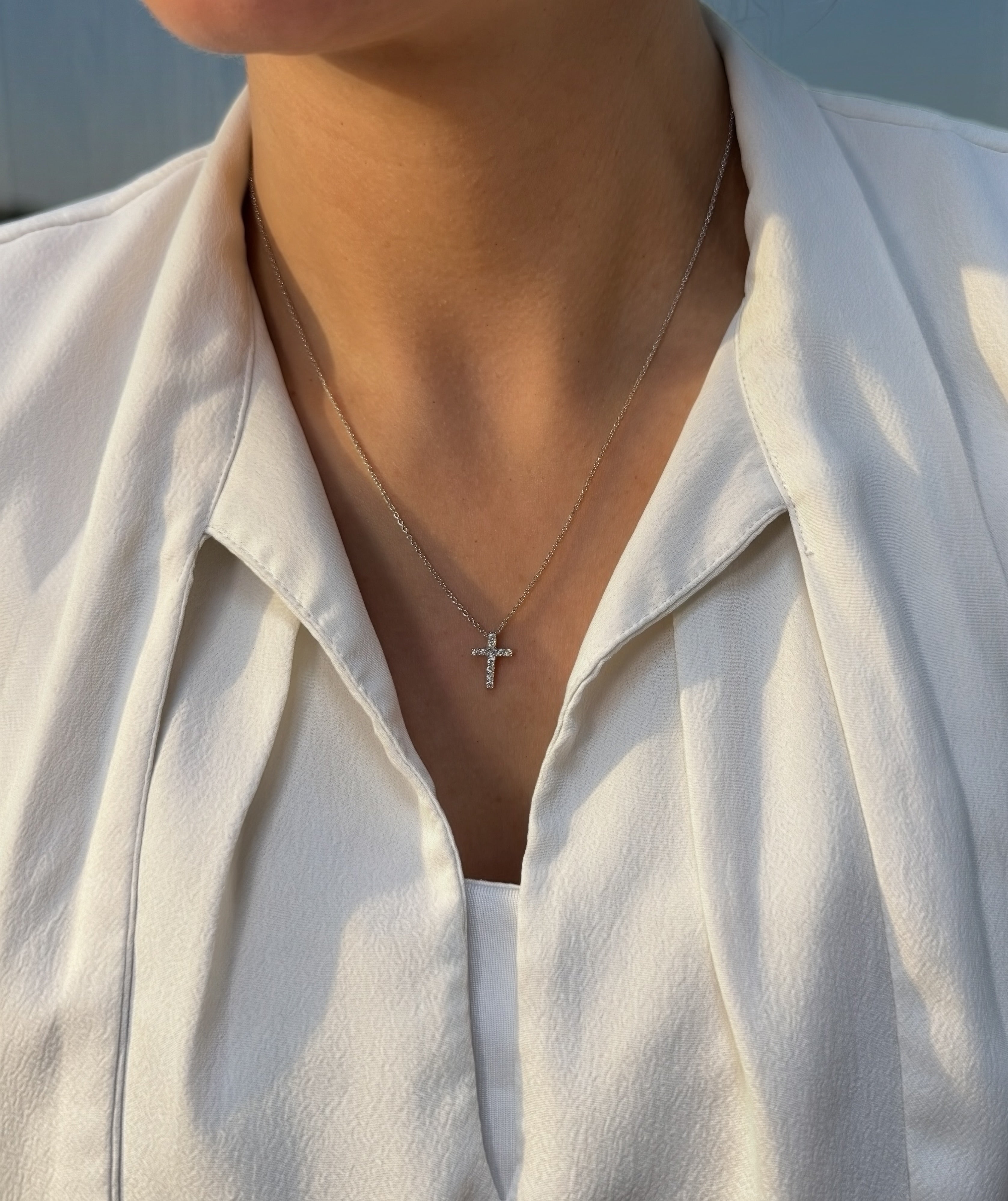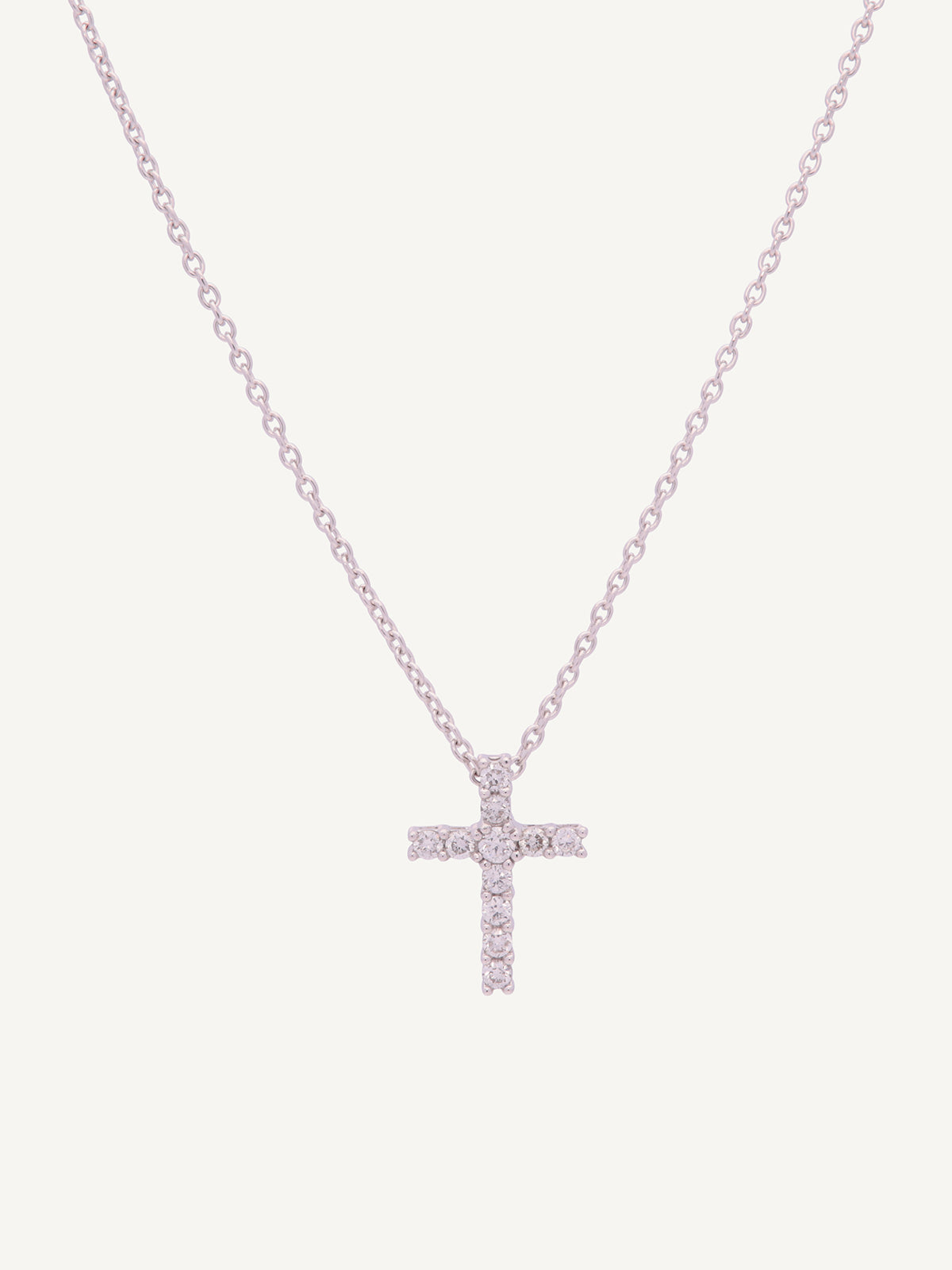 Crafted in 18ct white gold, this round brilliant claw set 0.18ct total diamond cross is paired with an 20" trace chain, offering a refined and discreet look.