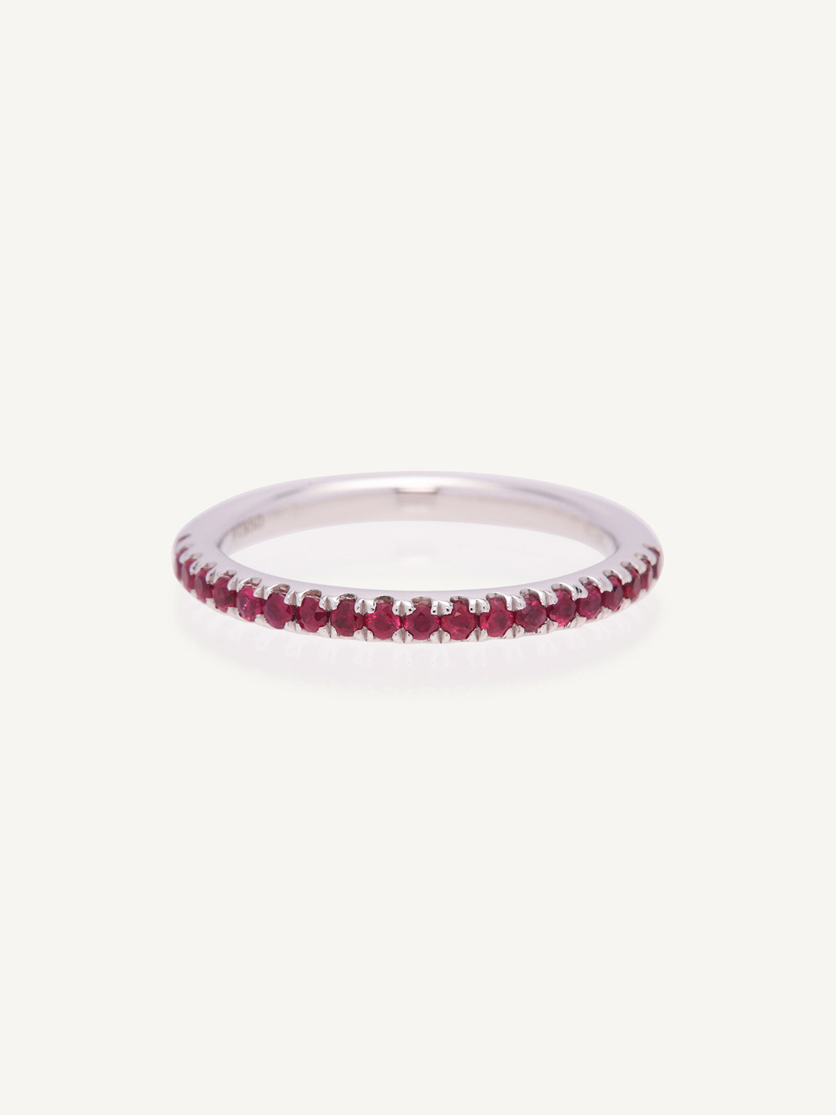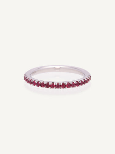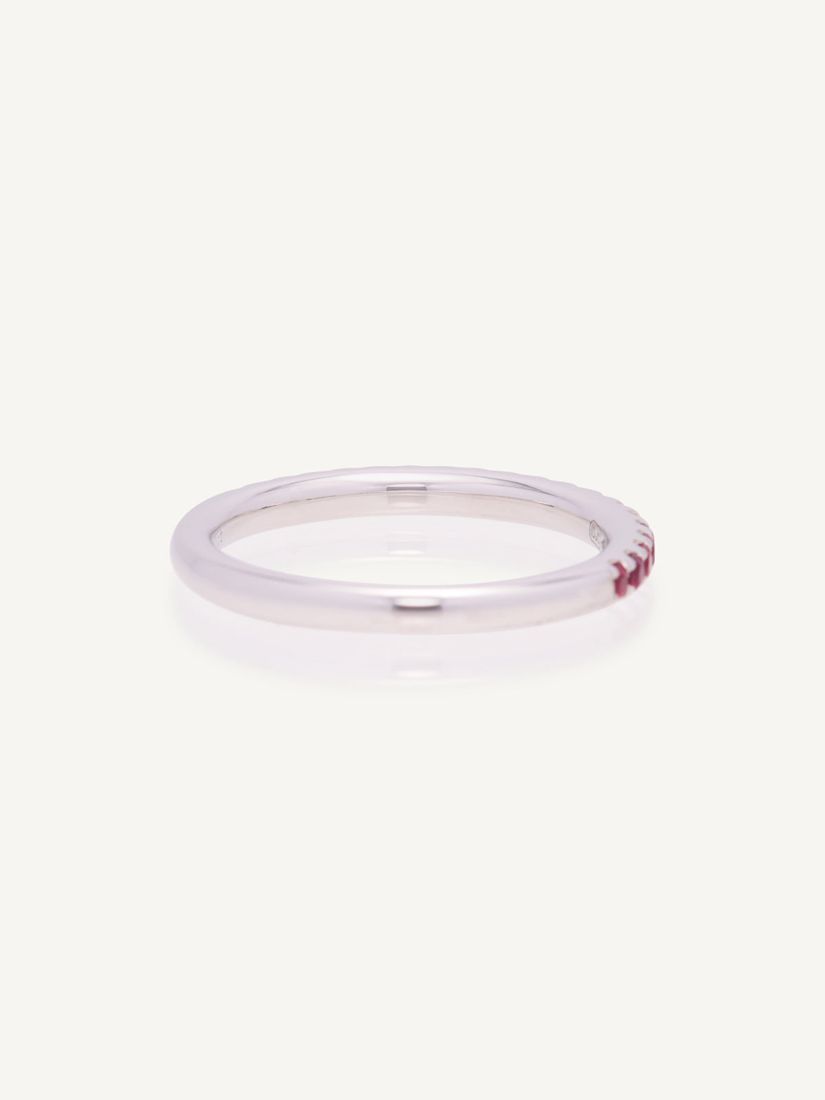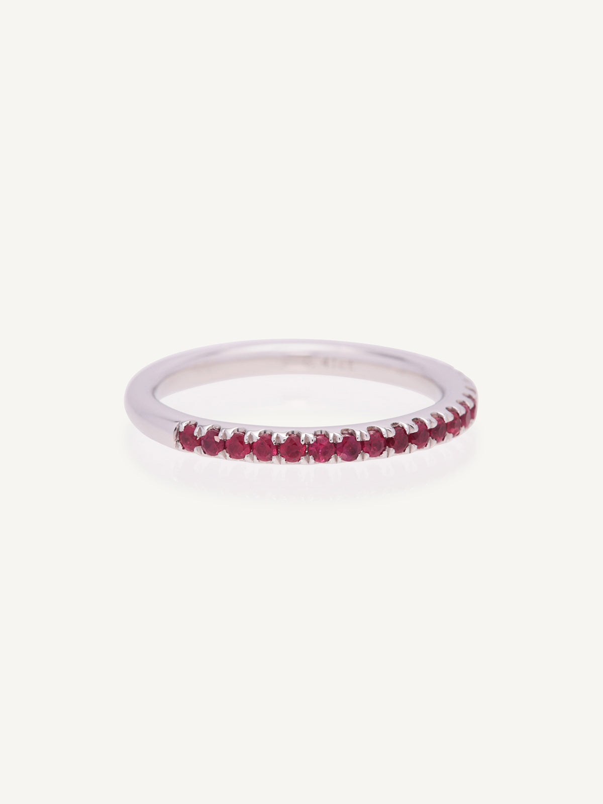 Elevate your ring stack with this gorgeous platinum micro claw set ruby 1/2 eternity ring. Vibrant rubies add a pop of colour to this beautiful piece.