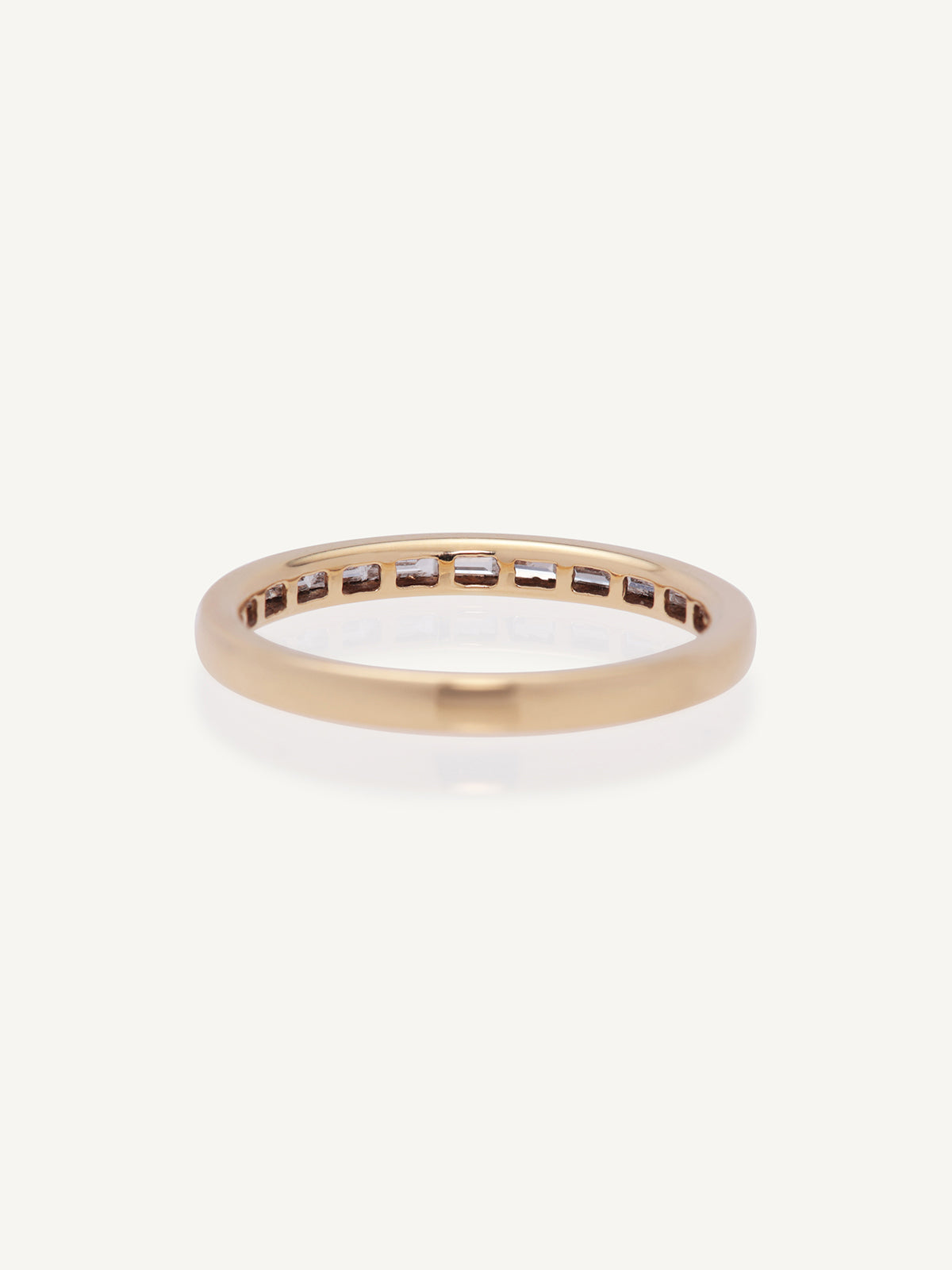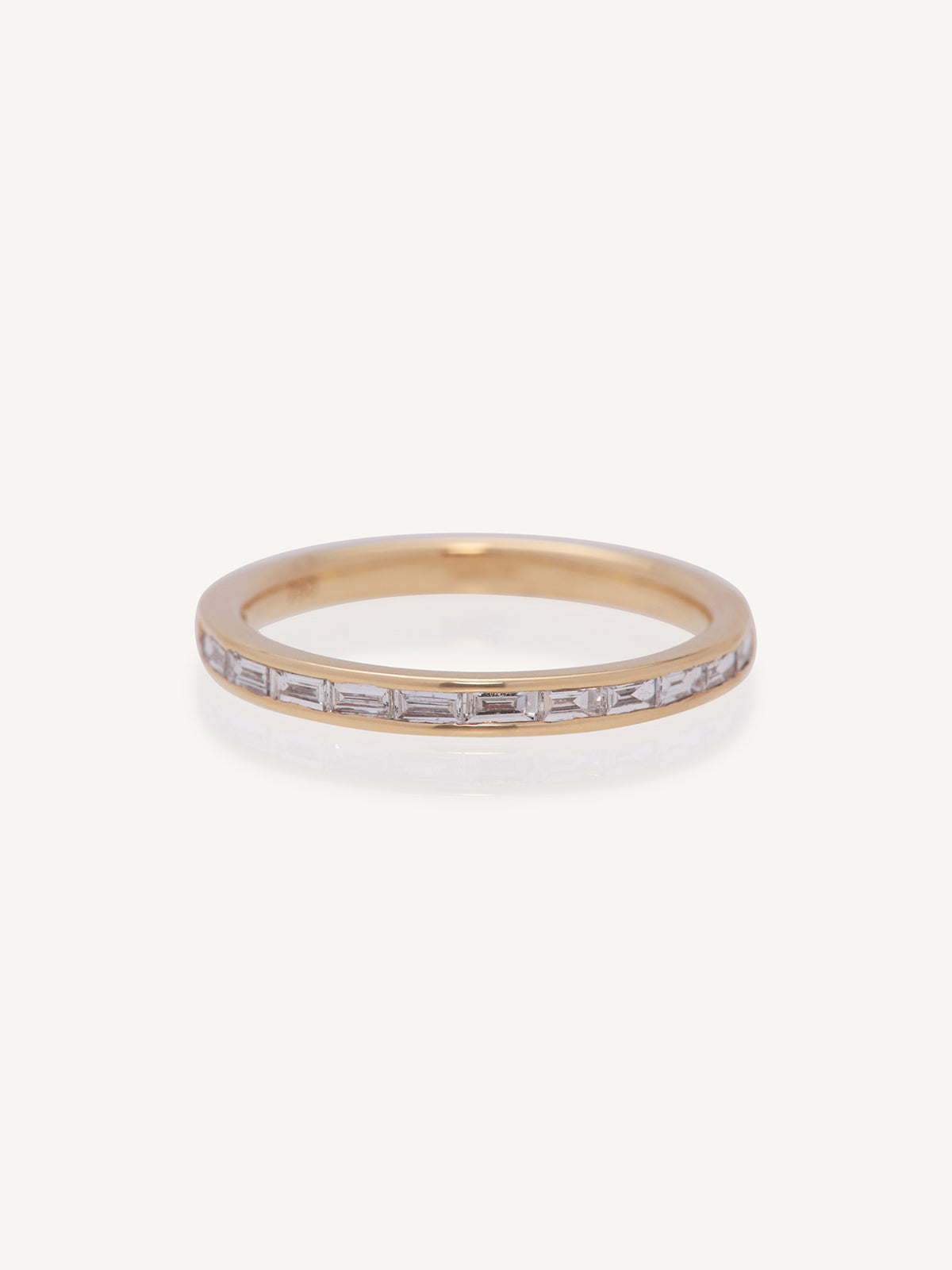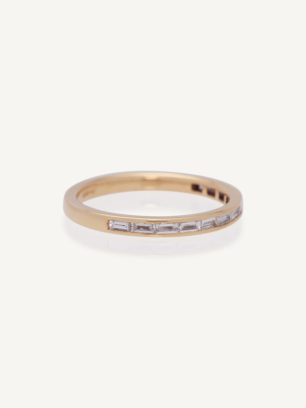 A stunning channel set ring that features horizontal baguette diamonds over half the band. The perfect addition to any jewellery collection.