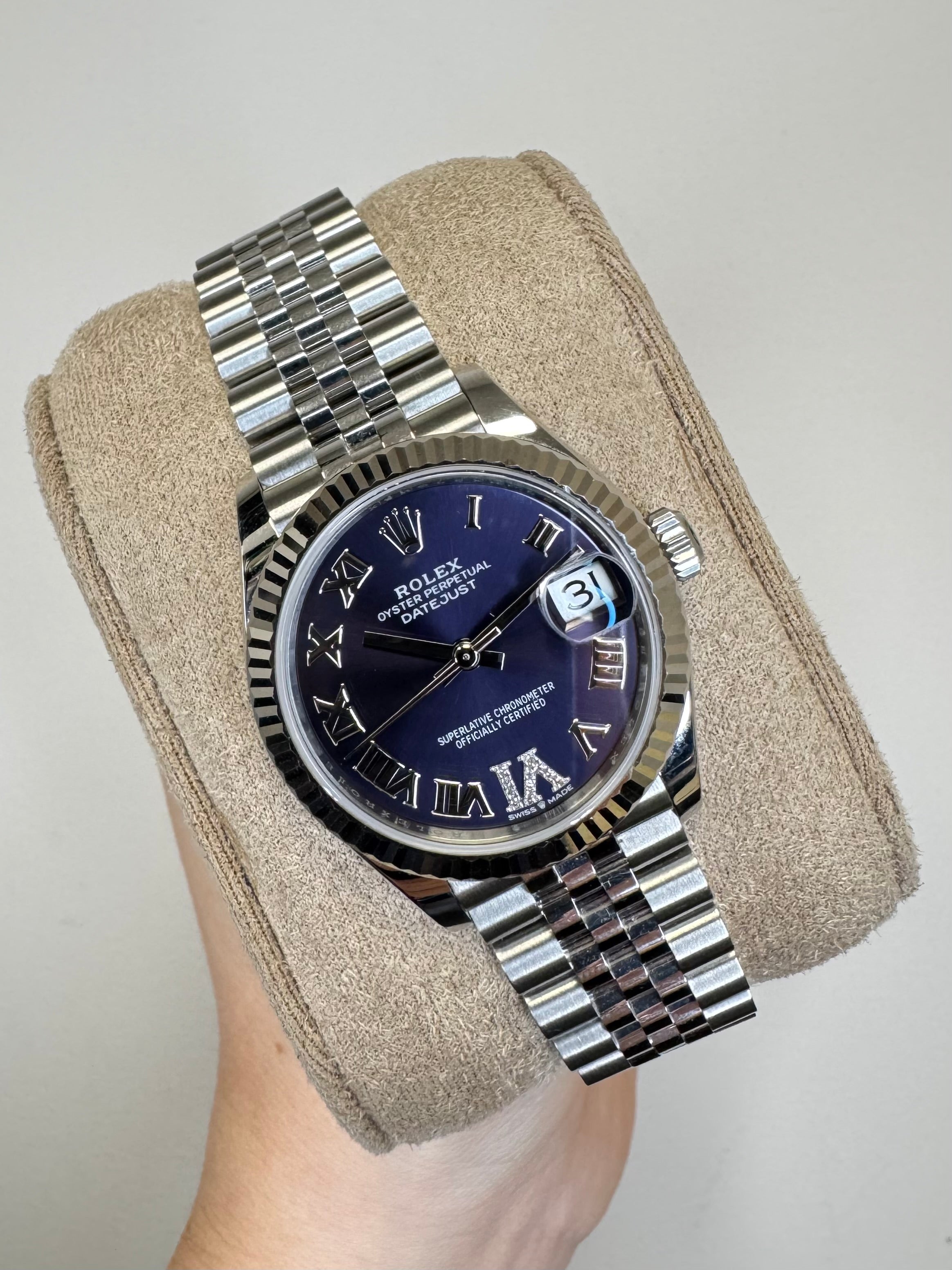 Rolex Datejust in stainless steel, model reference 278274. 31mm case, purple diamond VI dial with date aperture at 3 o'clock, 18ct white gold fluted bezel, sapphire crystal, automatic movement, Jubilee bracelet. Accompanied with a full set - Rolex box, papers dated 2021, green wallet, booklet, x2 Rolex swing tags.