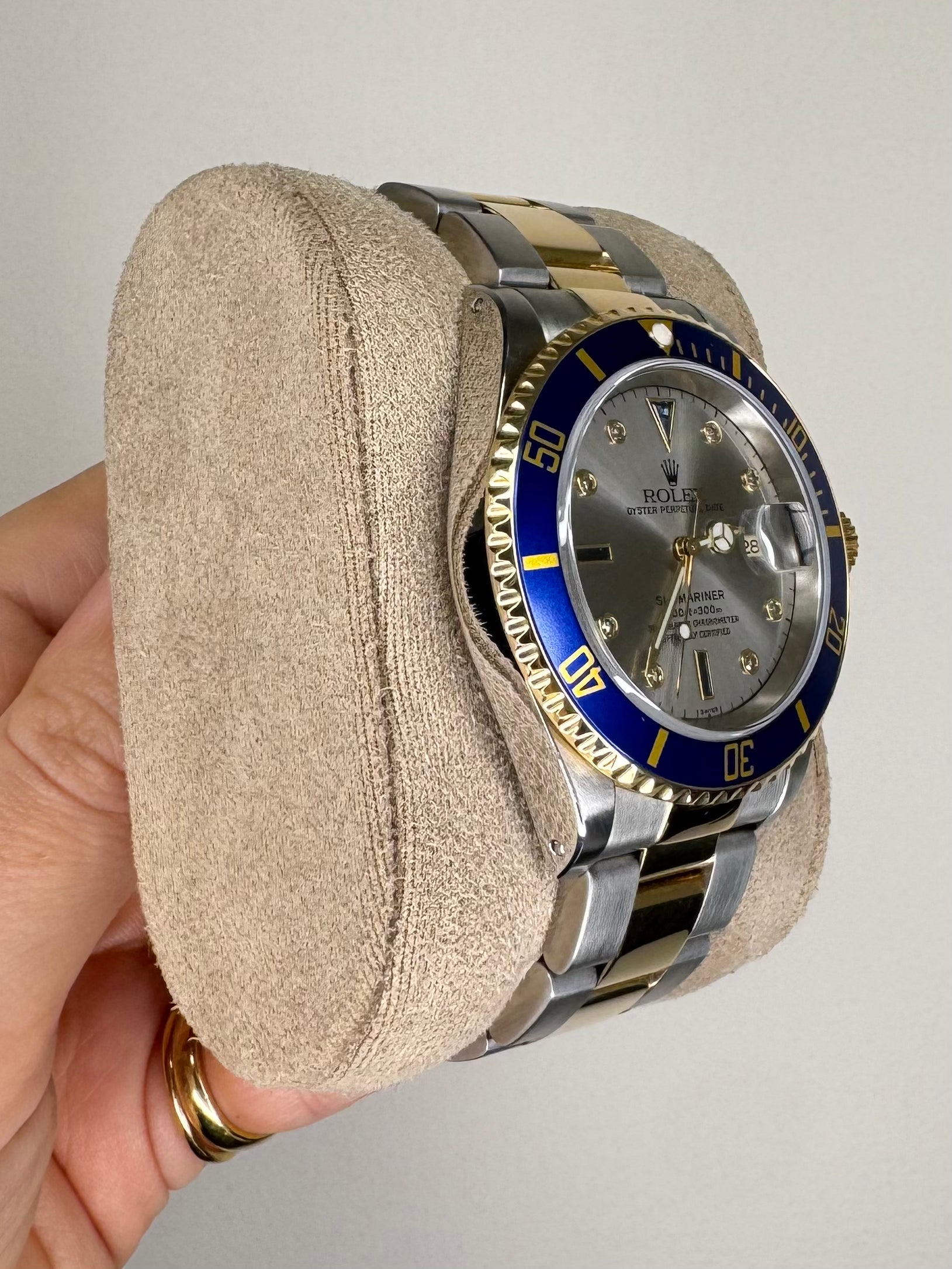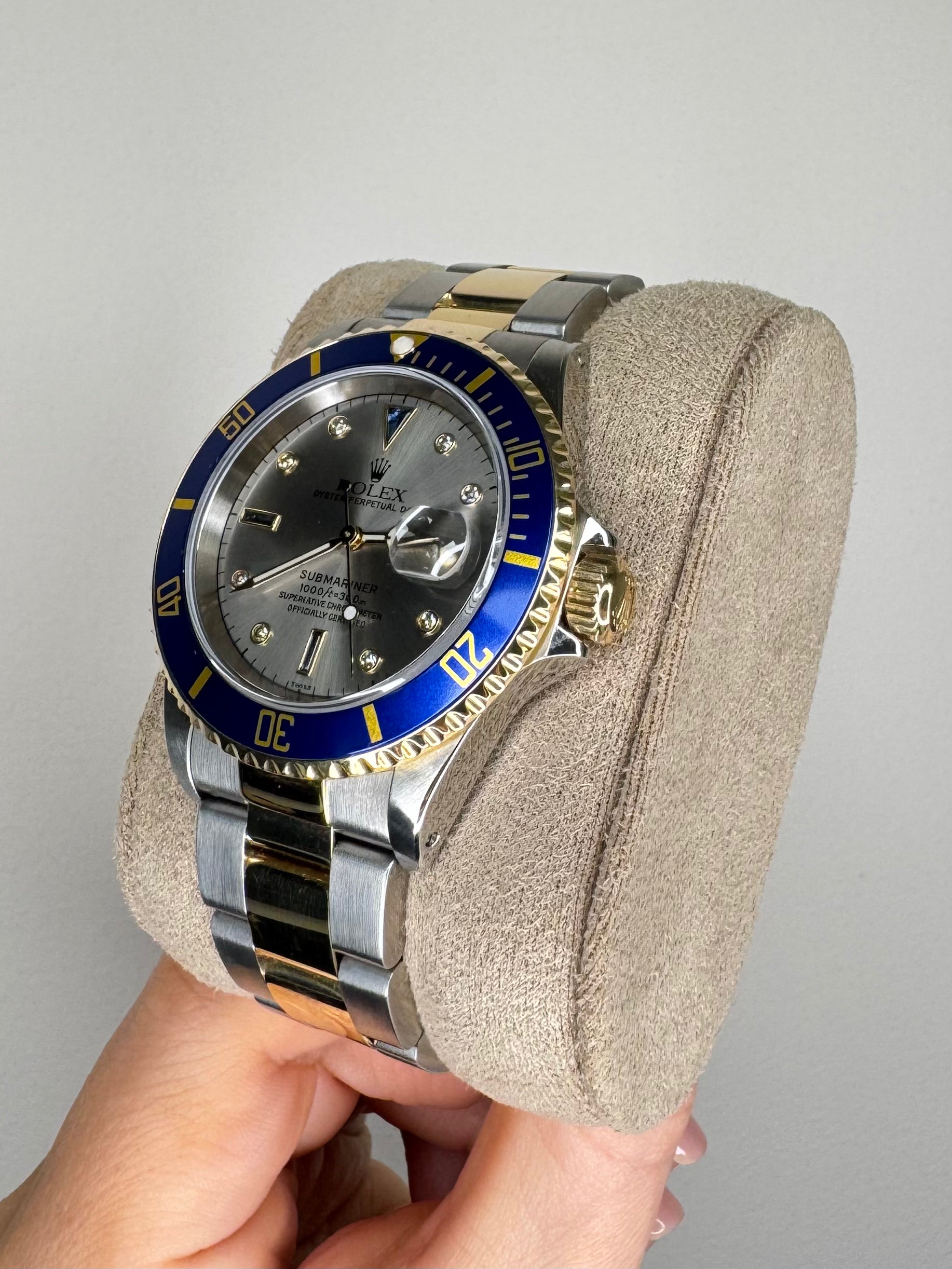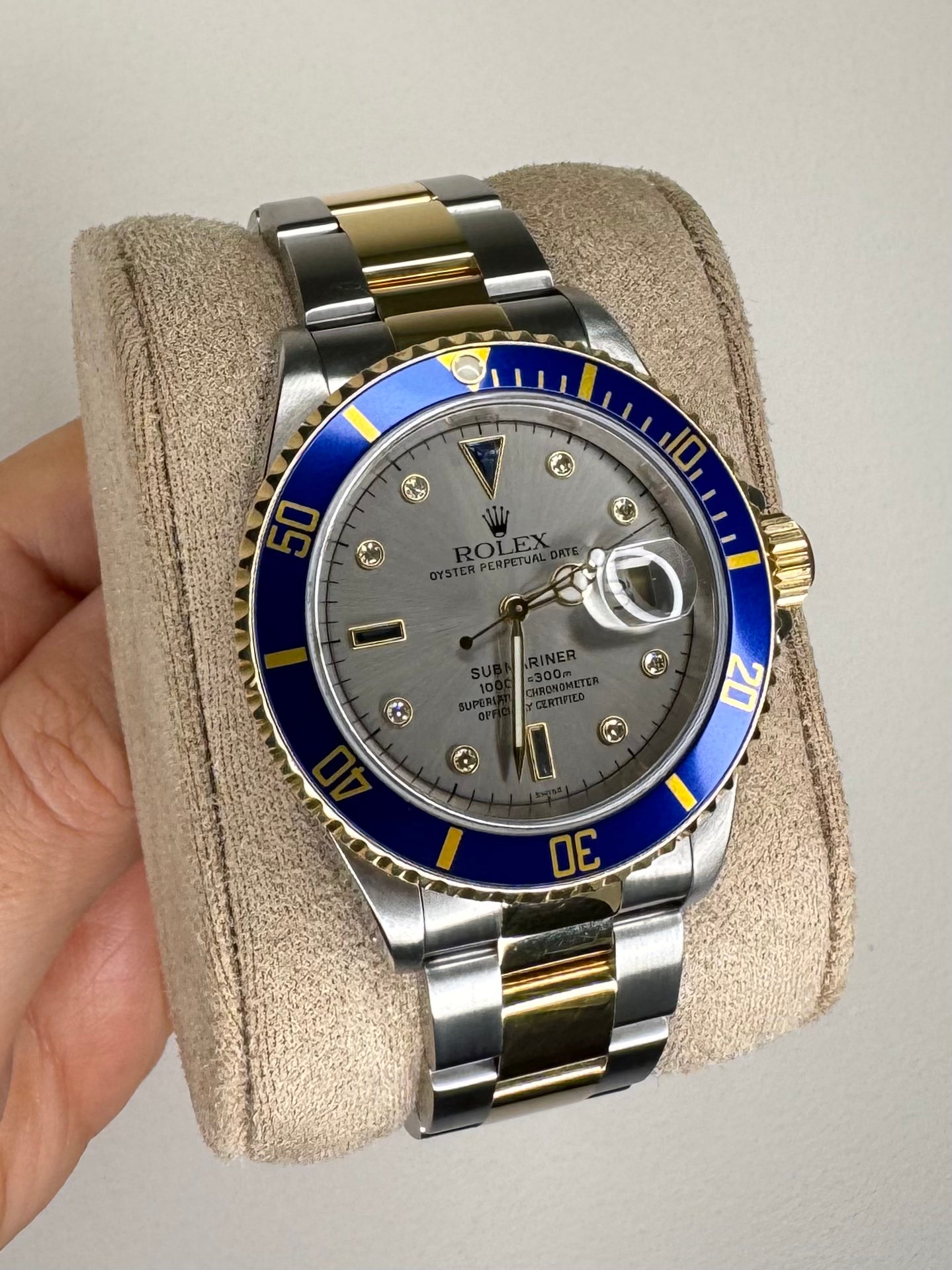 Rolex Submariner watch in stainless steel and 18ct yellow gold, model reference 16613. 40mm case, silver dial factory set with diamonds and sapphires, automatic movement, blue bezel insert, Oyster bracelet. Watch is accompanied with service box and service card. If you require any further information, please do not hesitate to contact our helpful team