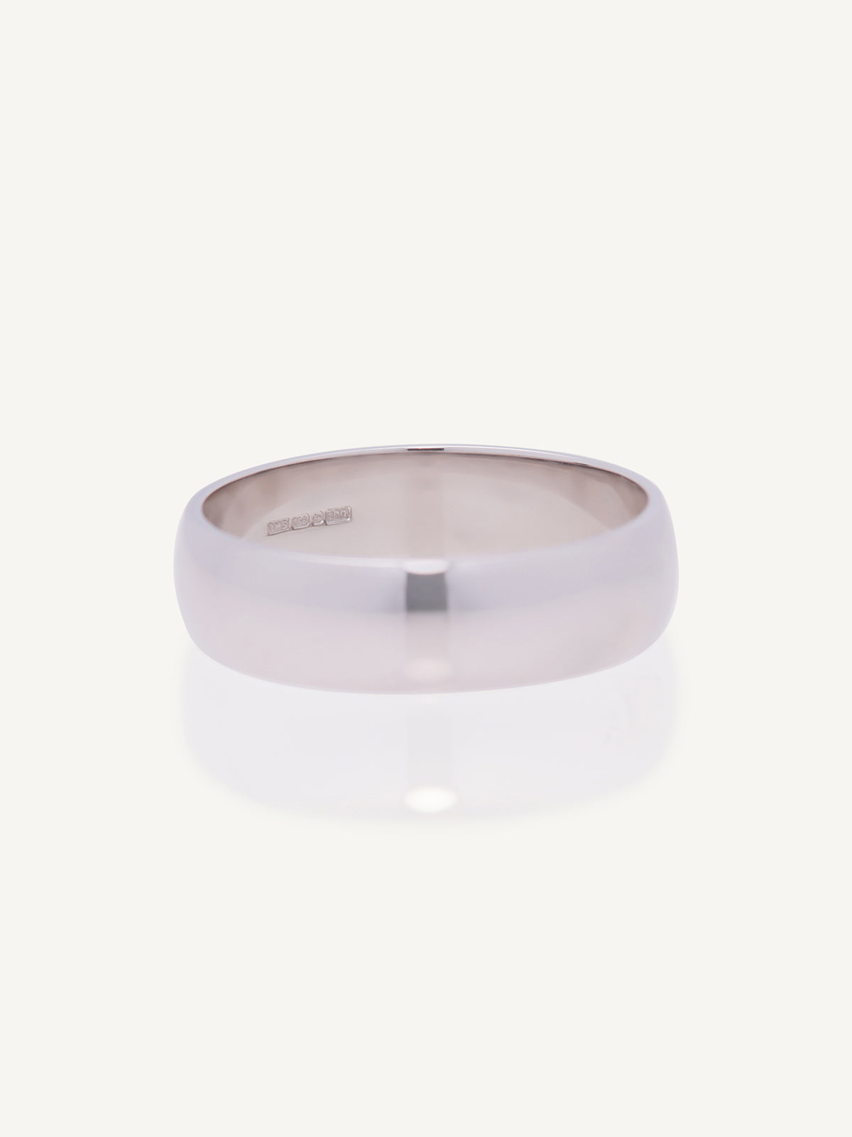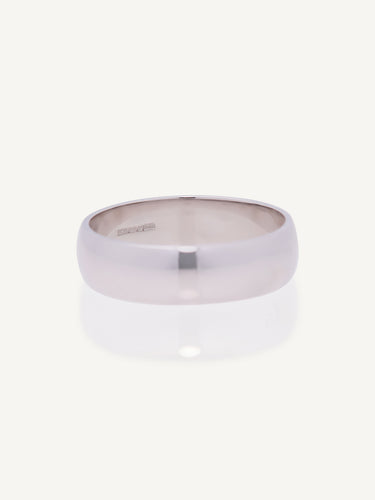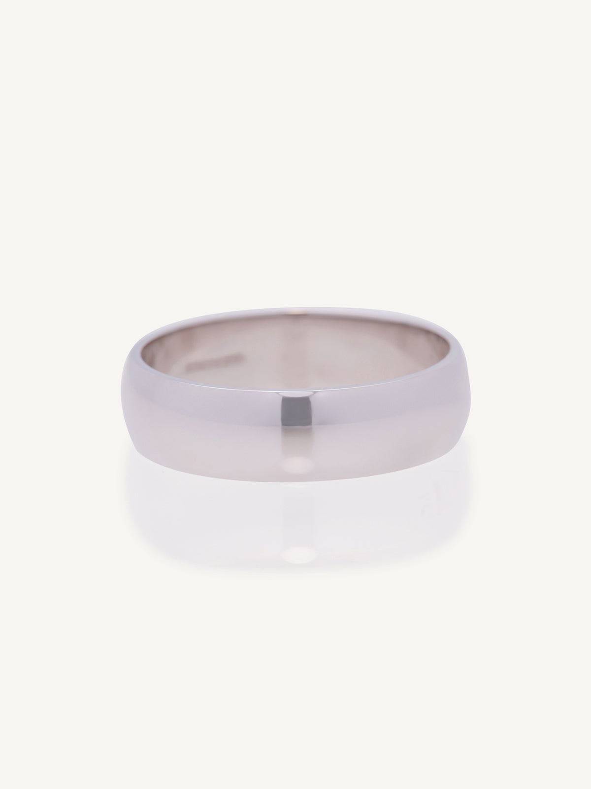 The outside of the ring is gently curved with the inside of the ring flat against the finger.