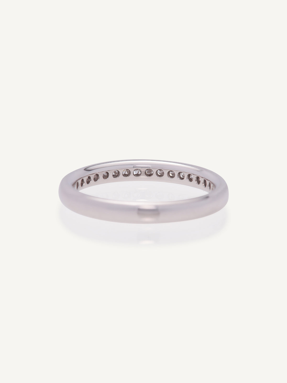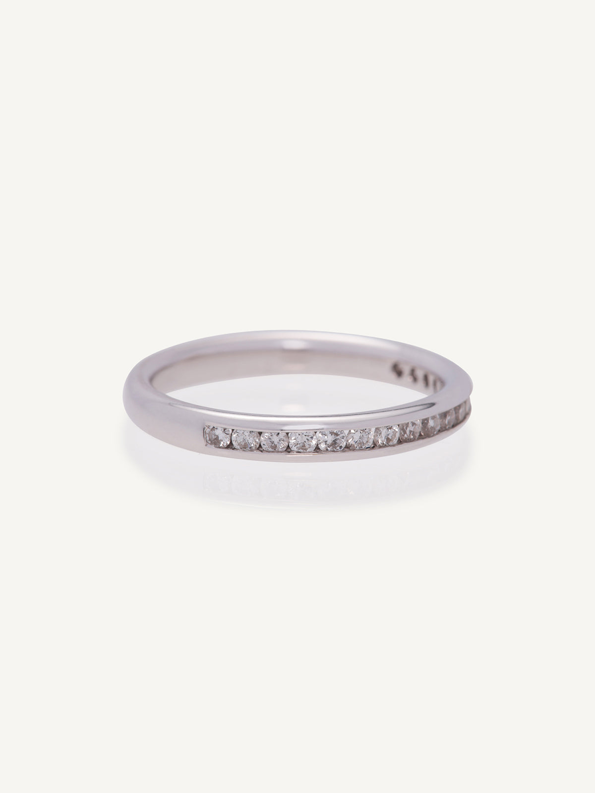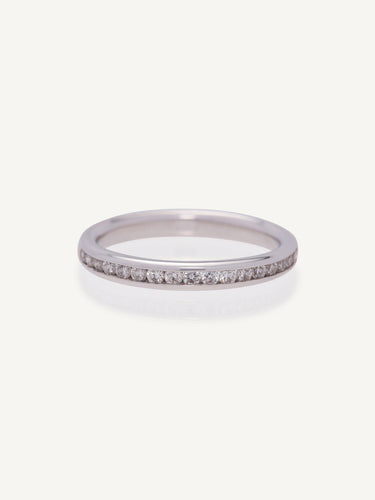 A stunning eternity ring that features a row of high quality round cut diamonds channel set half the way around the band. This ring is a statement on its own but also makes a beautiful wedding band.