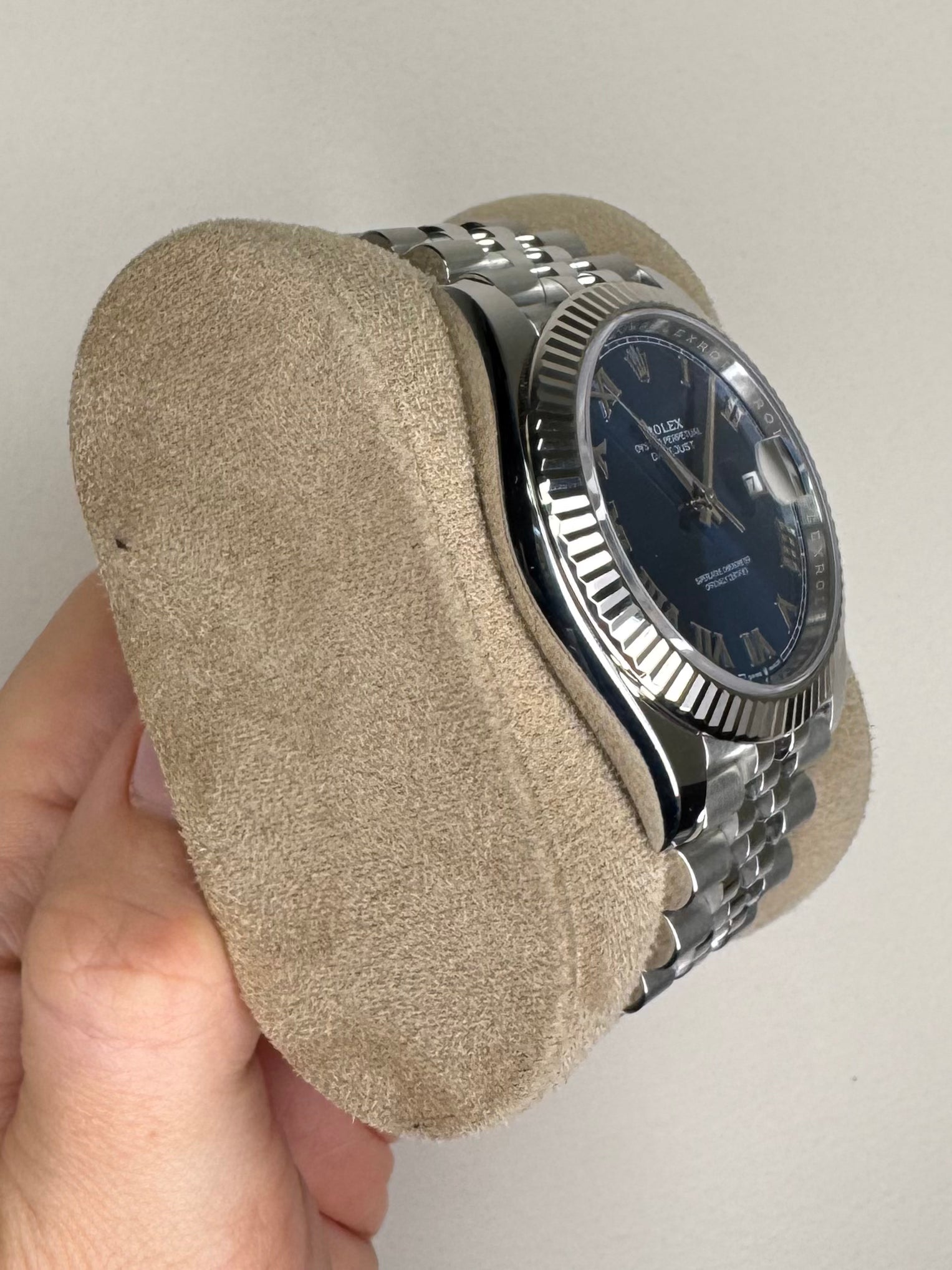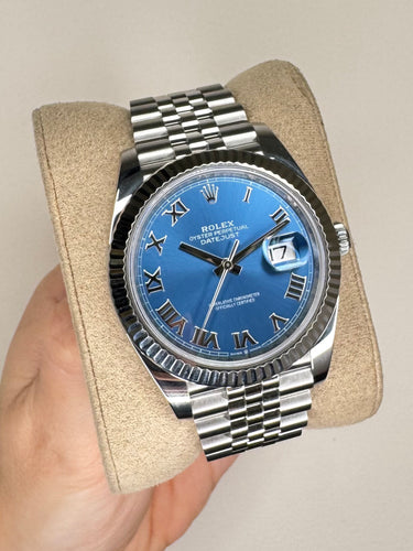 Rolex Datejust watch in stainless steel and 18ct white gold fluted bezel, model reference 126334. 41mm case, blue roman numeral dial with date aperture at 3 o'clock, automatic movement, Jubilee bracelet. Accompanied with a full set - Rolex box, guarantee card dated 2023, booklet, Rolex Swing tag. This watch is under manufacturer warranty until 2028. If you require any further information, please do not hesitate to contact our helpful team.