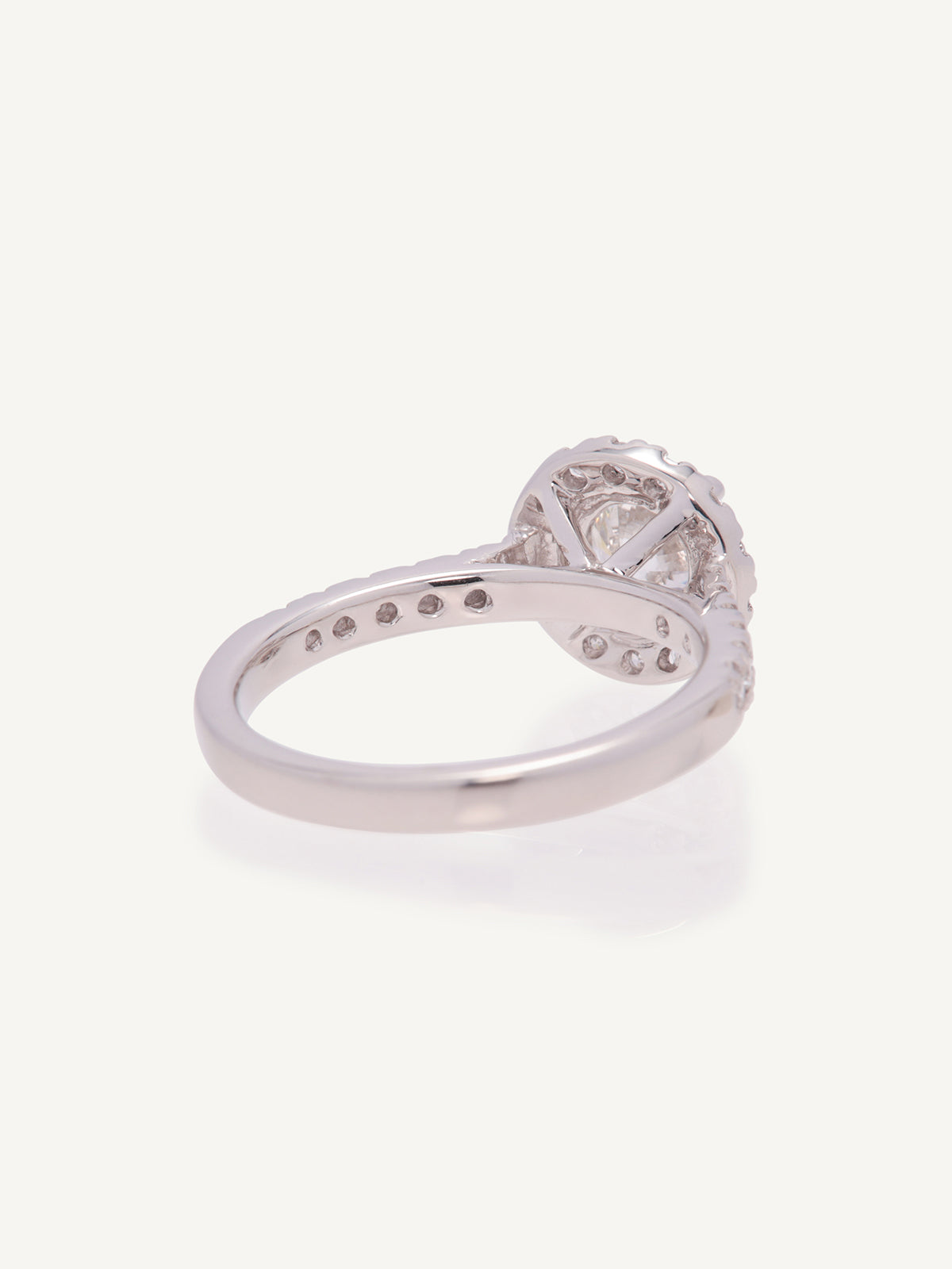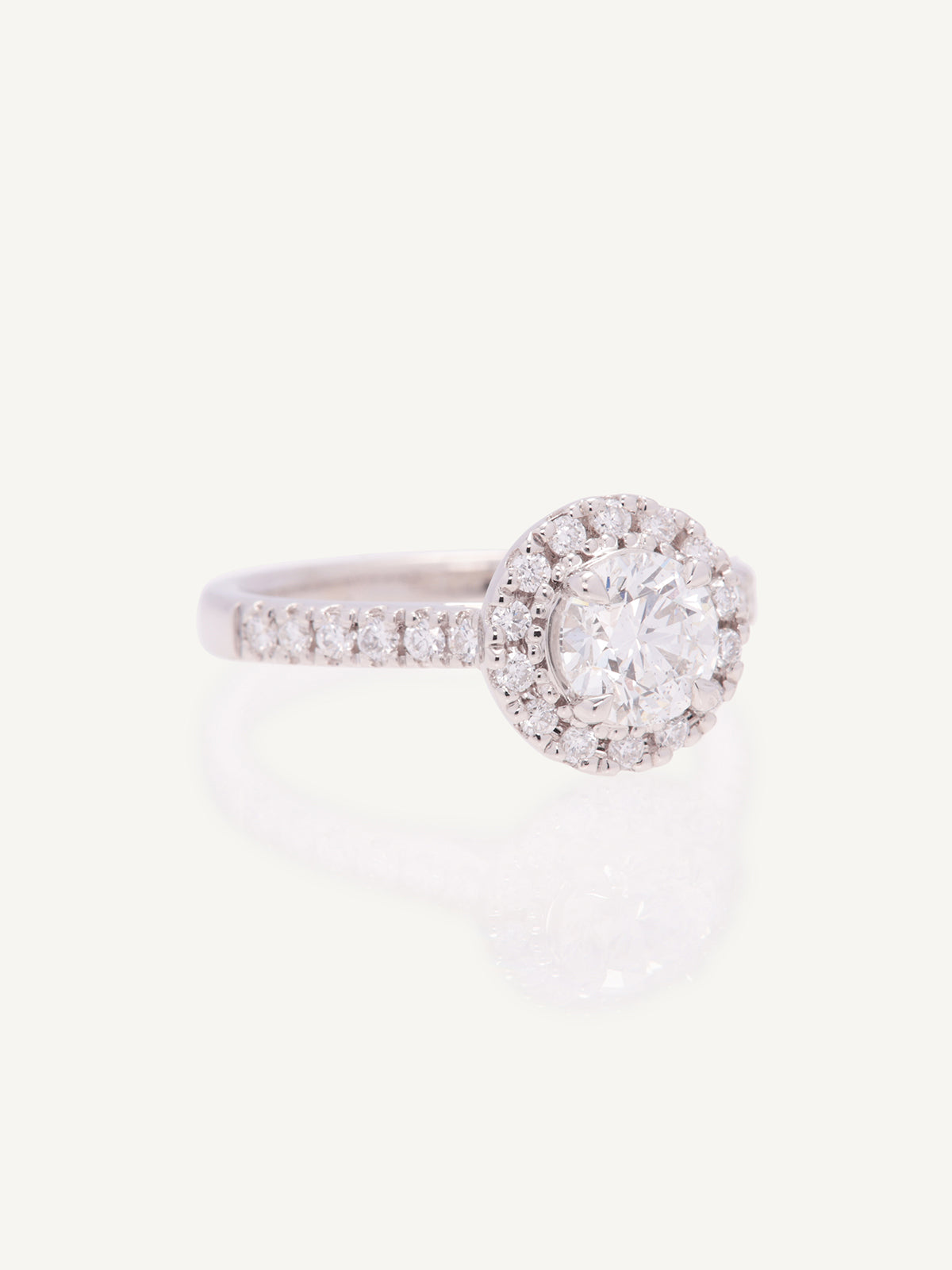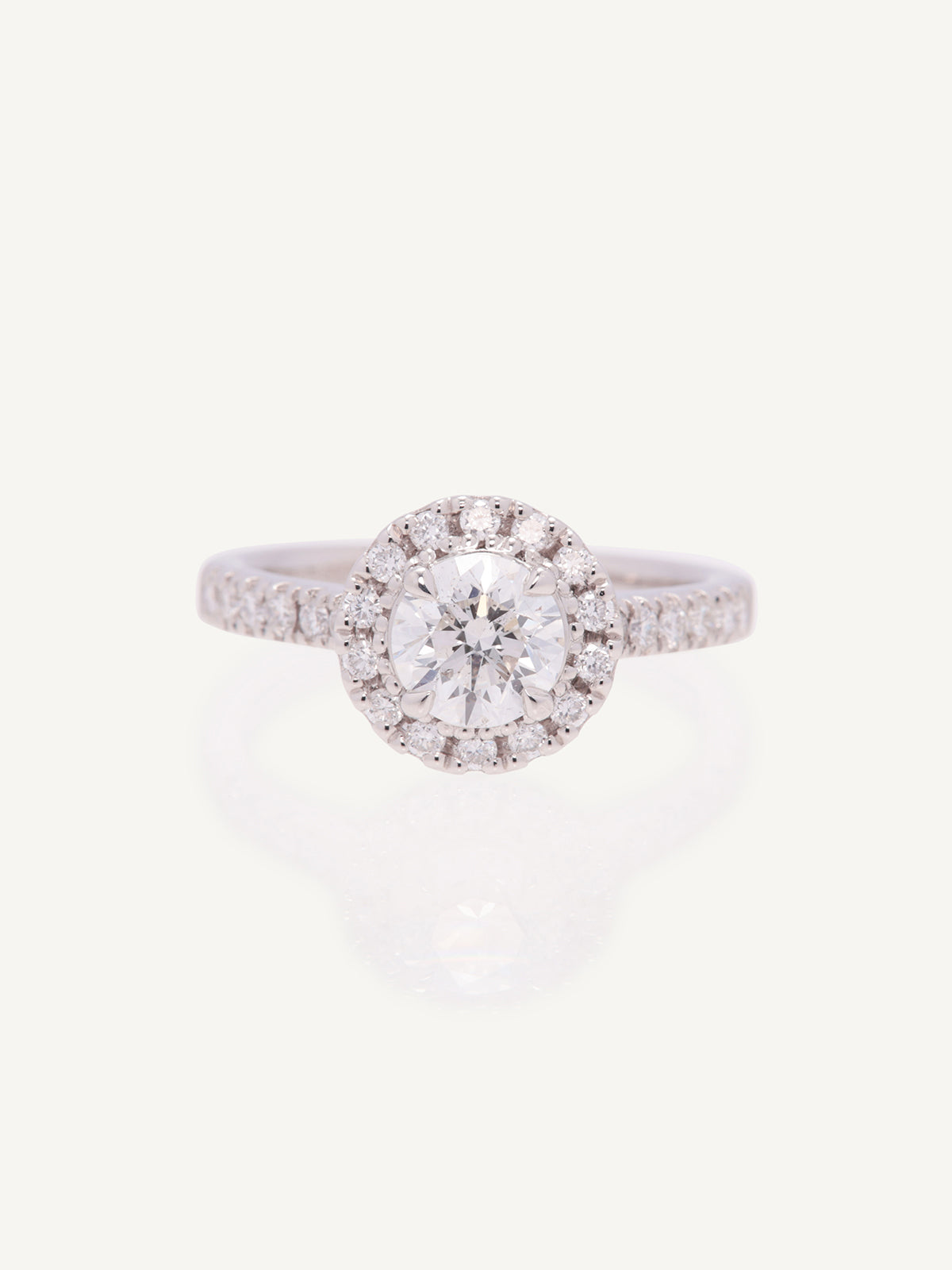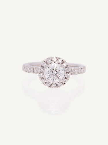 A perfectly designed platinum round brilliant diamond halo cluster ring. A 0.90ct centre set with 0.34ct of round brilliant diamonds set into the halo and band.